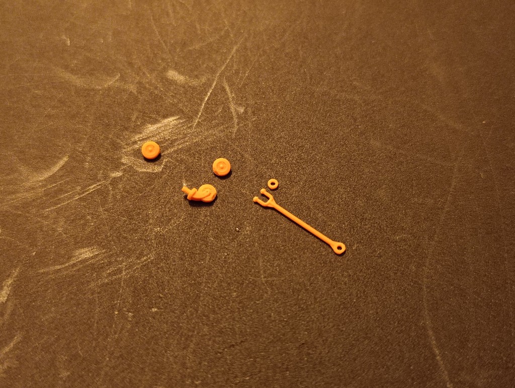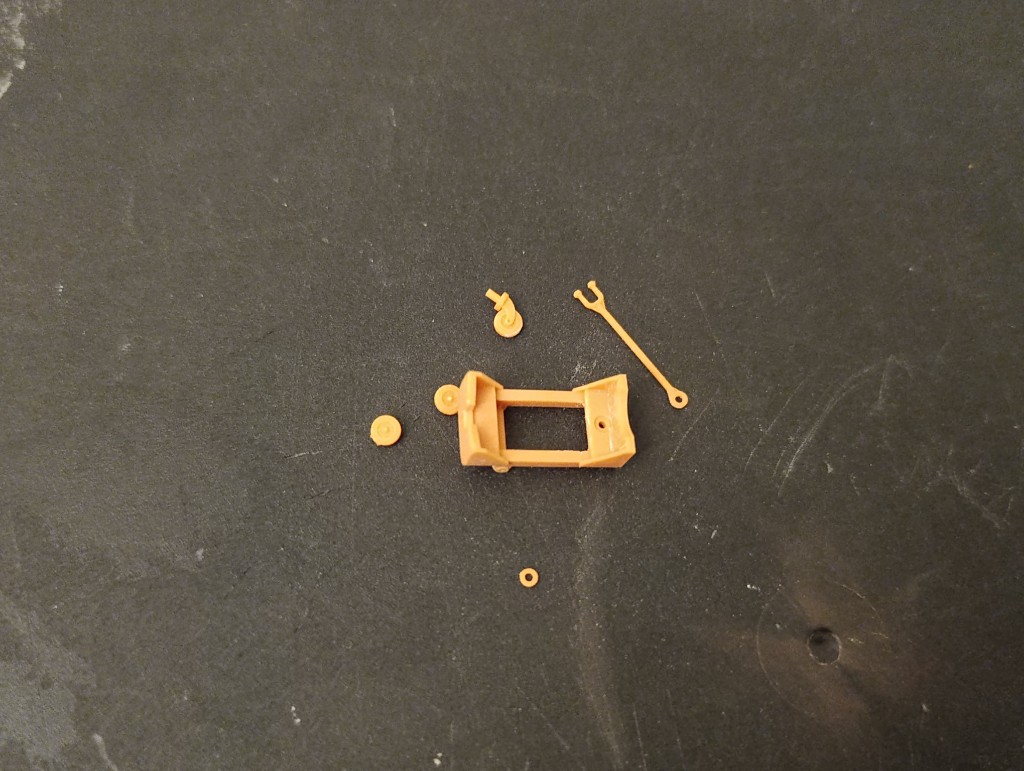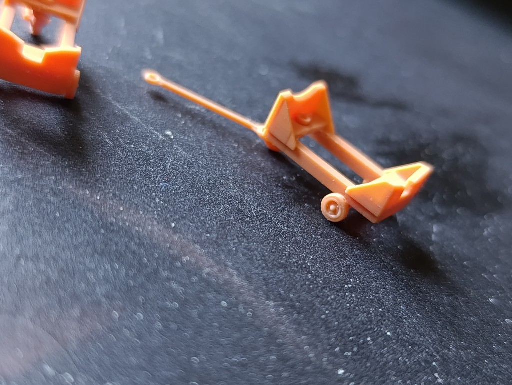 Die Angussstellen versäubert, wobei darauf zu achten ist, dass das Material brüchig ist und nicht flexibel wie Plastik. Die Teile mit Sekundenkleber zusammengesetzt und eigentlich war es dann schon mit dem komplizierten Teil.