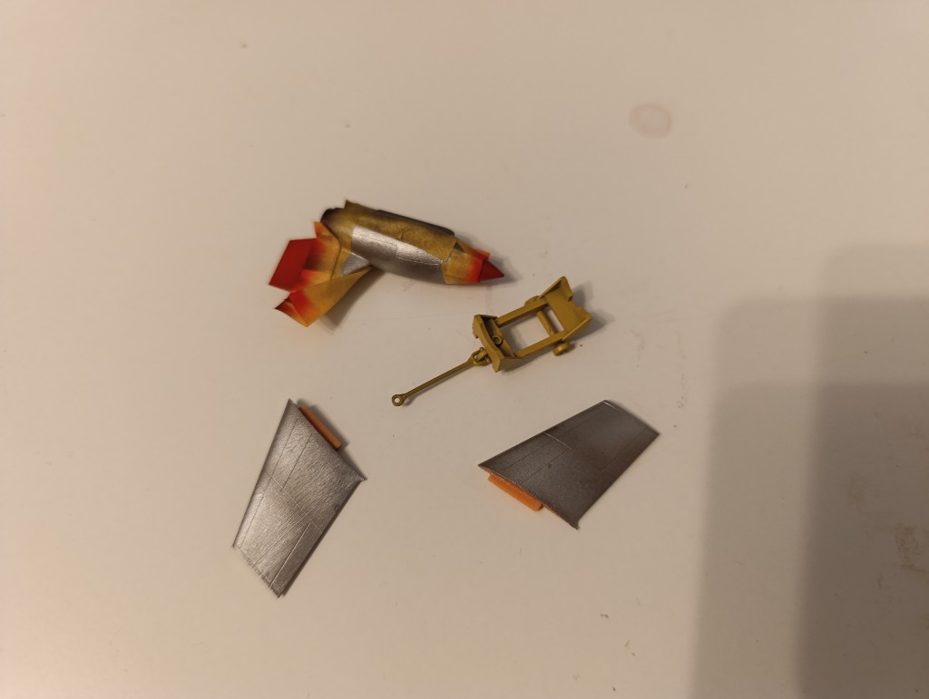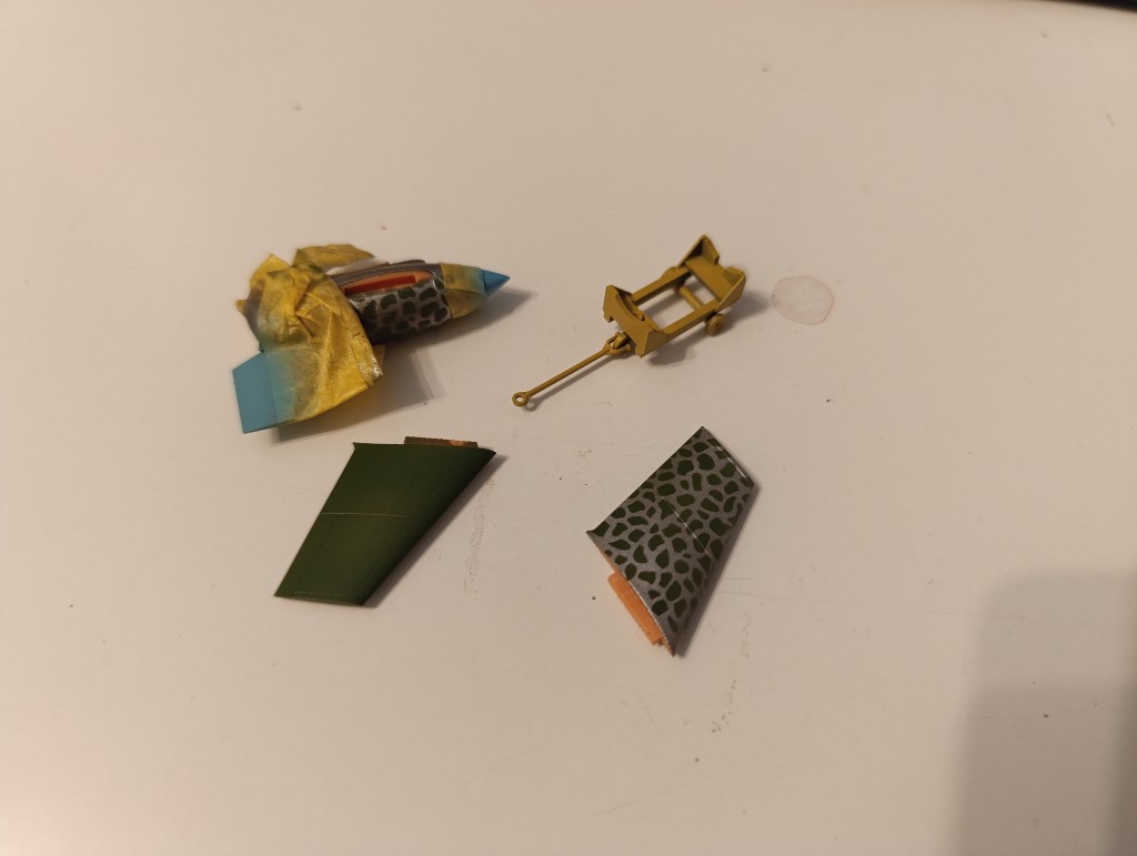Die zweite Rakete habe ich mit einer Schablone ein Tarnmuster verpasst und ein Flügel komplett lackiert, weil das ein Ersatzteil darstellen soll.