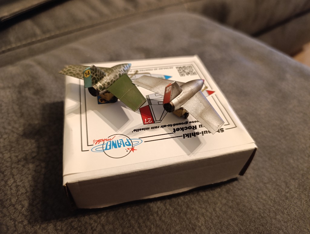 Gerne. Naja Alterung schon, denn diese Raketen waren ja dafür ausgelegt feindliche Bomber durch Rammen zum Absturz zu bringen, daher habe ich leichte Kratzer an der Nase der grünen angebracht.