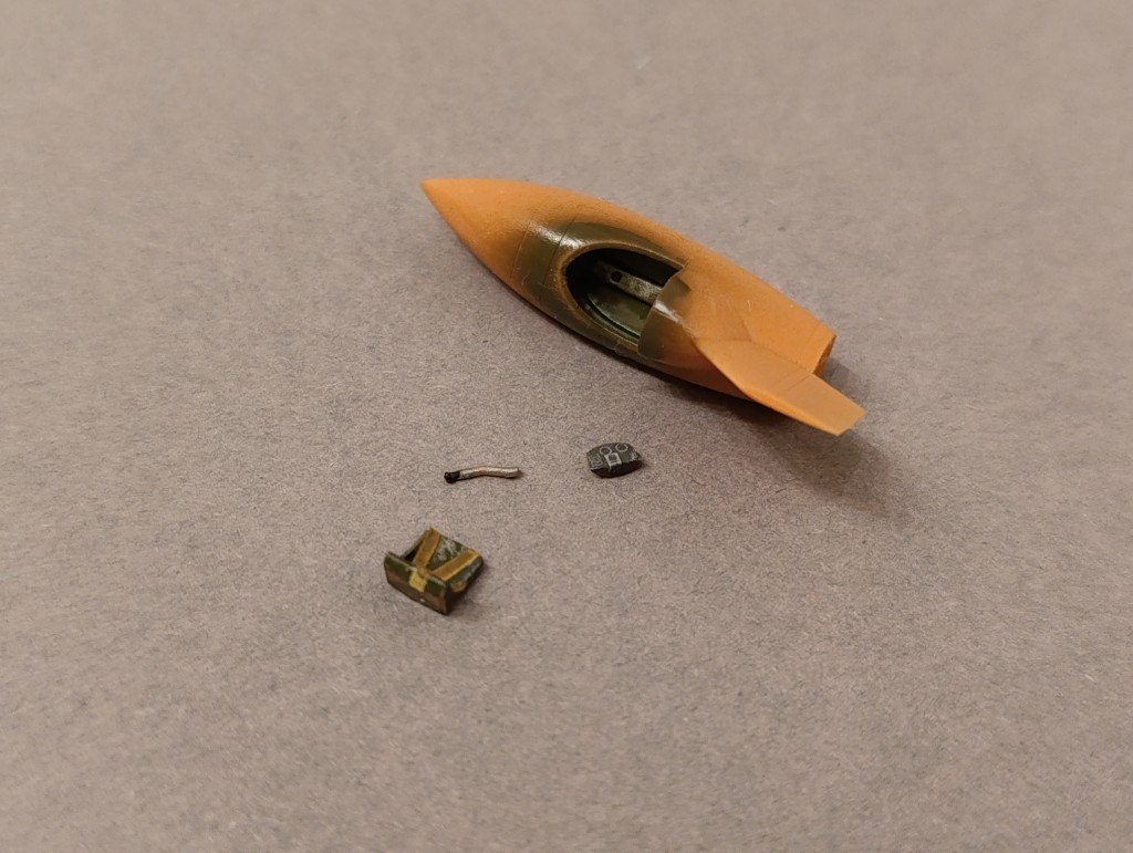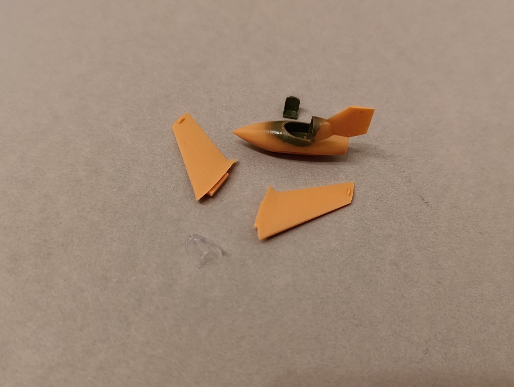 Die Einzelteile dazu habe ich schon ausgetrennt, dies waren die Flügel, Sitz, Konsole, Steuerhebel, Flugzeugrumpf. Aus dem Vacumaterial habe ich das Klarteil ausgeschnitten, das war tatsächlich schwieriger als ich in Erinnerung hatte.