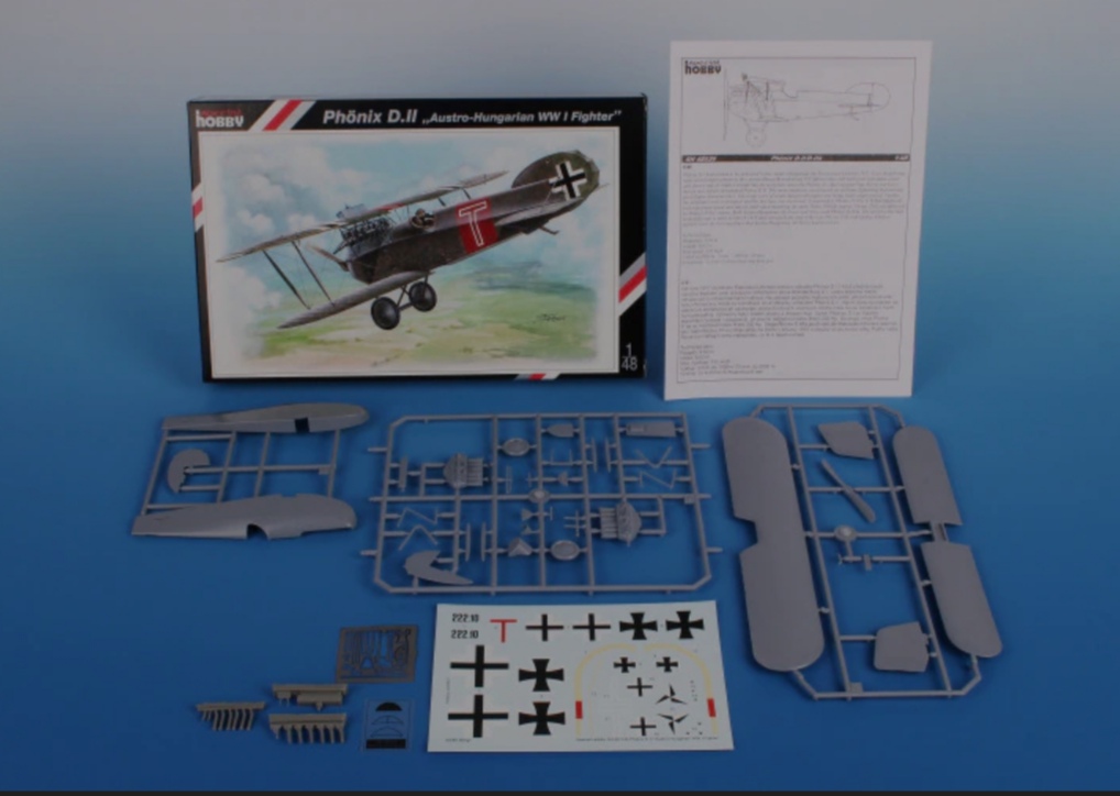 Entschieden habe ich mich für die Phönix D.II aus dem Hause Special Hobby in 1:48 und ein erster Blicken verrät schon, das wird kein leichter weg. Schon 2004 erschien bei Special Hobby der Vorgänger Phönix D.I im Folge Jahr hat man einen Gussrahmen ausgetauscht und einen neuen dazu gelegt und die Phönix D.II rausgebracht. Der Bausatz ist ShorRun und das merkt man auch: relativ wenig Details im Cockpit, gerade am Motor und sitz Gussfehler (so sind die Zwischenräume zwischen den Zylindern teilweiße zugegossen), ansonsten haben wir Resinteile und ein klein PE-Bogen mit sehr weichen Material. Die Instrumententafel ist falsch dargestellt. Was mir jetzt schon Sorgen bereitet ist die Bemalung, ich werde mich beim Bau an den Bausatz von Lukgraph in 1:32 halten.