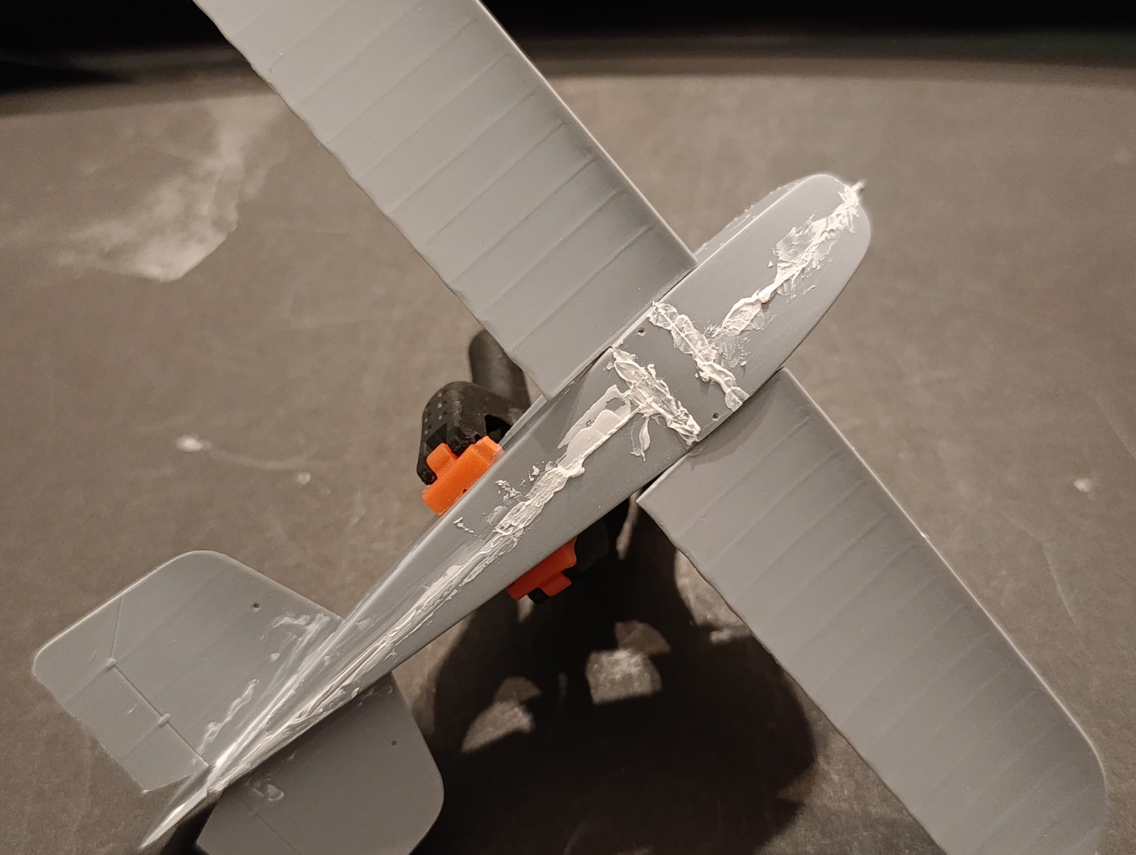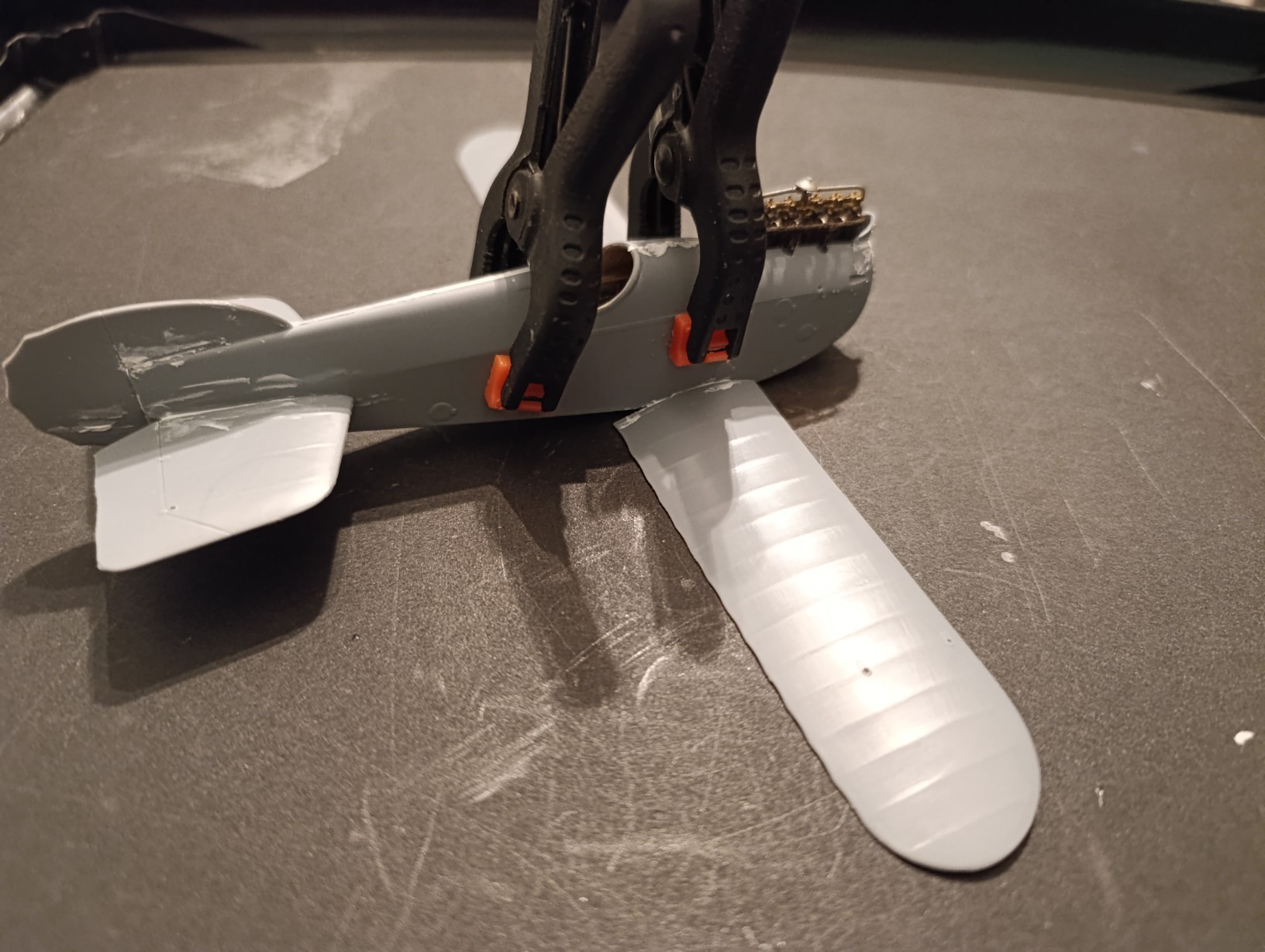 Wie zu sehen ist konnte ich einiges hier machen, so sind Flügel angebracht. Dummerweise ist die Trennstelle zwischen dem Rumpf an einigen Stellen aufgebrochen, das heißt nochmals spachteln, an dem Übergang ja so wieso.