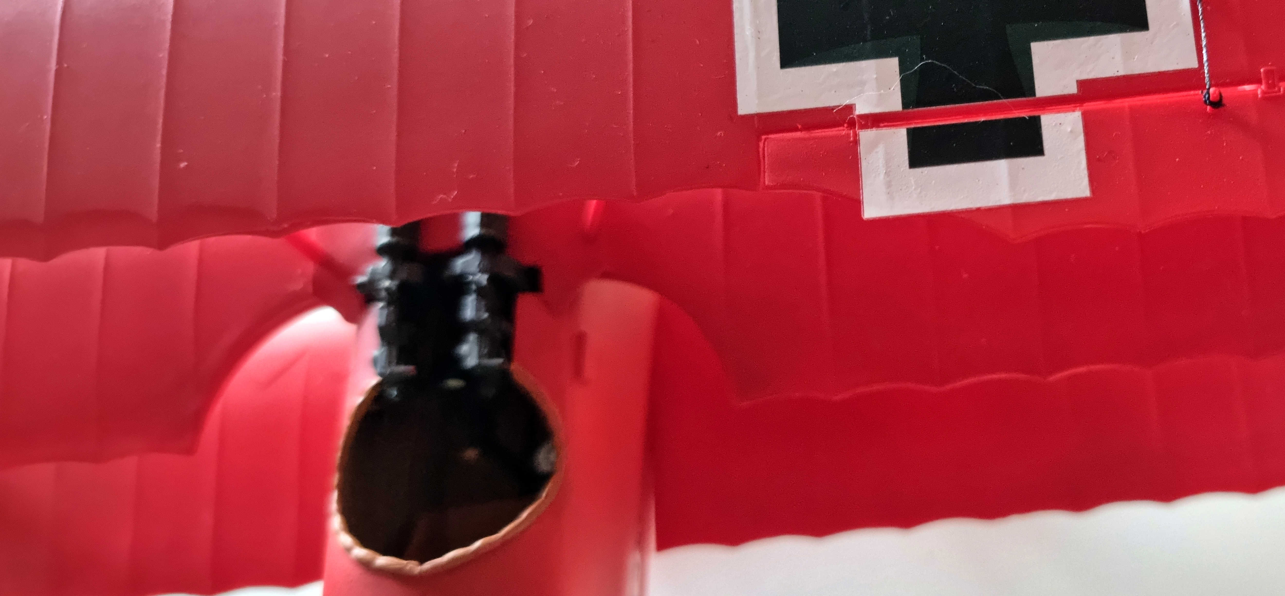 Leider merkt man dem Modell deutlich das Alter an. Der Bausatz stammt laut Scalemates aus dem Jahr 1957 und hat zuletzt 1978 neue Bauteile bekommen. Im Vergleich zu neueren Bausätzen musste ich viel nacharbeiten, Auswerfermarken entfernen und an der ein oder anderen Stelle improvisieren. Sehr deutlich hat man es an einer der drei Figuren gemerkt. Diese hatte beim Zusammenkleben sehr große Löcher im Bein. Daher habe ich darauf verzichtet die Figur weiter zu bearbeiten. Zudem hat der obere Flügel zwei Fehler. Auf der linken Bildseite sieht man, dass der Kunststoff nicht richtig in die Form geflossen ist. Auf der rechten Bidseite, wo das Abziehbild etwas übersteht, fehlt ebenfalls etwas Kusntstoff. An der Stelle ist der Flügel nicht symmetrisch.