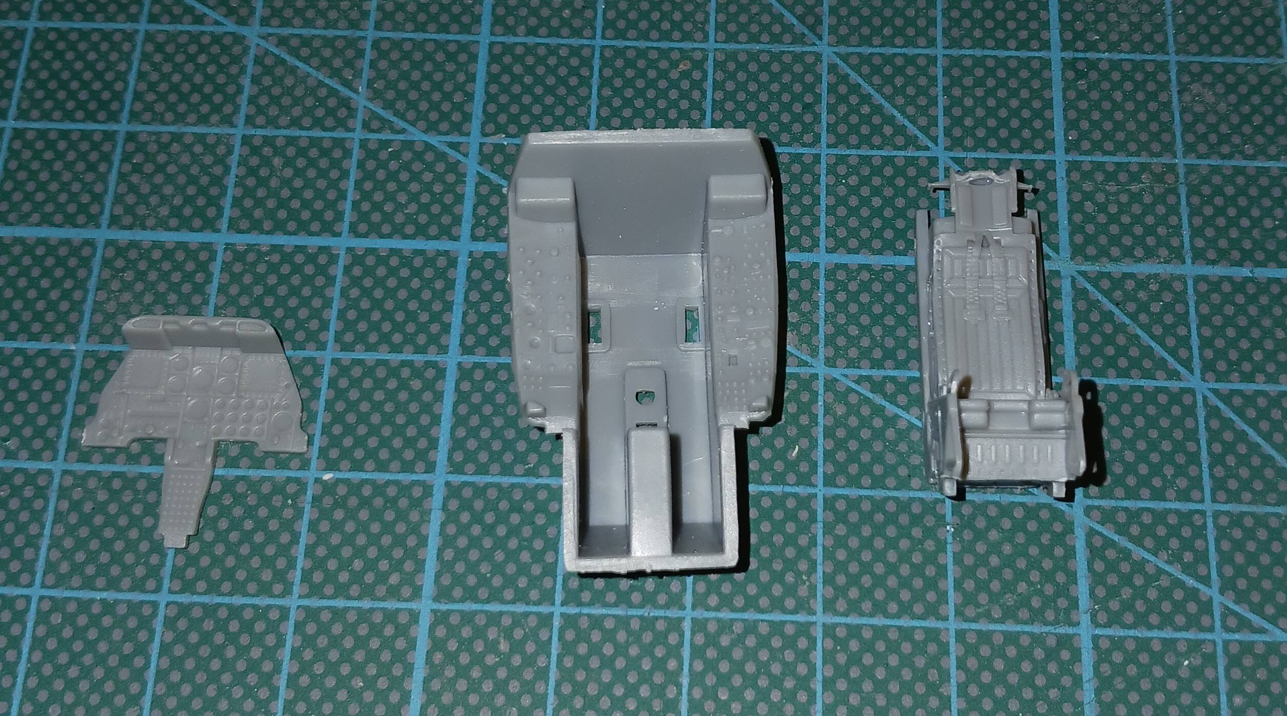 Angefangen habe ich mit dem Cockpit. Hier die ersten Teile mit dem schon zusammengebauten Schleudersitz. Die Teile weisen sehr feine strukturen auf. Für das Armaturenbrett und die Seitenkonsolen liegen Decals bei. Da ich das Cockpit geschlossen lassen werde, reicht mir das völlig aus.