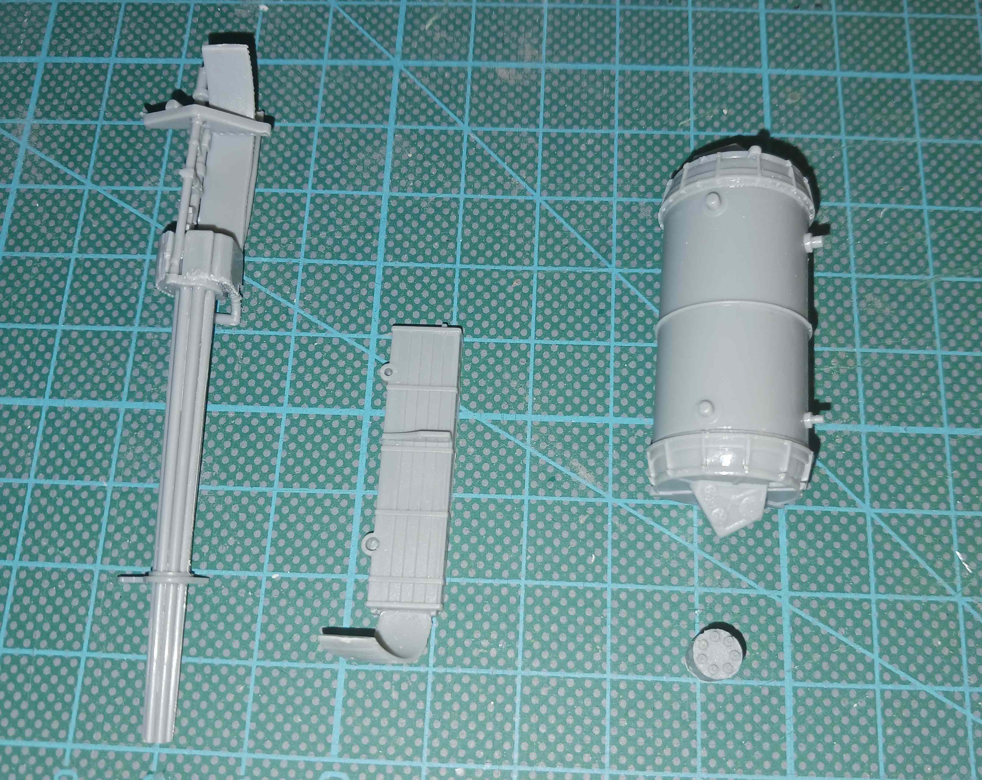 Die Hauptkomponeneten sind inzwischen zusammengebaut und mit ganz wenig Putty verspachtelt. Die Passgenauigkeit ist eigentlich sehr gut, aber kleine Spalten bleiben hier und da doch, was aber kein Problem ist. Ich bin einmal mit Vallejo Acrylic Plastc Putty über den Spalt gegangen und habe den Überschuss mit einem feuchten Wattestäbchen abgewischt. Fertig.
