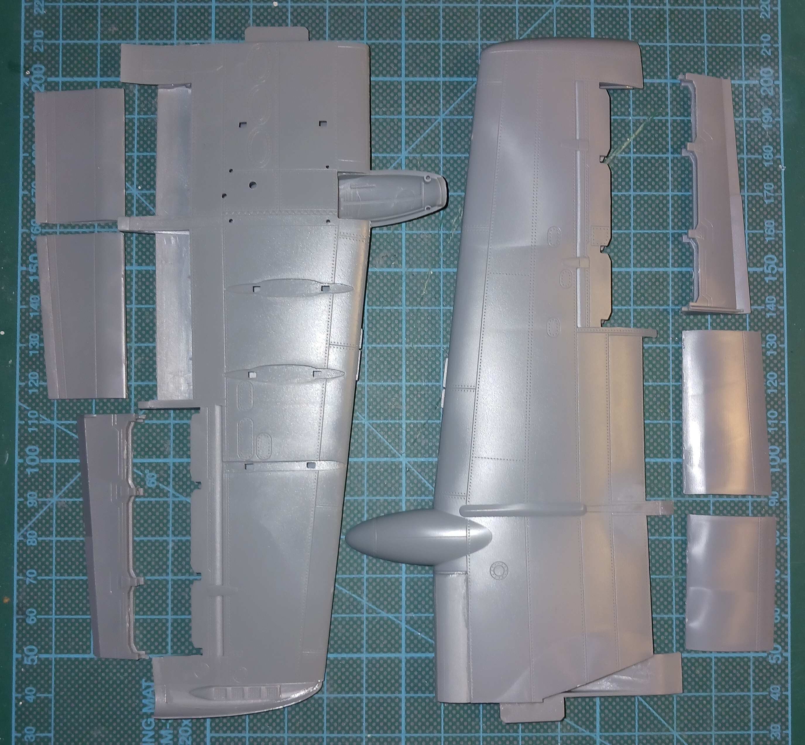 Während ich das Cockpit lackierte (und während die Farben trockneten), habe ich die nächsten Teile, die Tragflächen und die Steuerklappen, aus den Gießästen getrennt, versäubert und zum Teil schon verklebt. Leider passen die äußeren Klappen nicht so besonders. Die Aussparung für den unteren Zapfen ist fast einen halben Millimeter zu klein (oder der Zapfen zu groß) und alle anderen Zapfen sind ein kleines Stück gegenüber den Aussparungen versetzt. Hier muss noch etwas geschliffen werden.