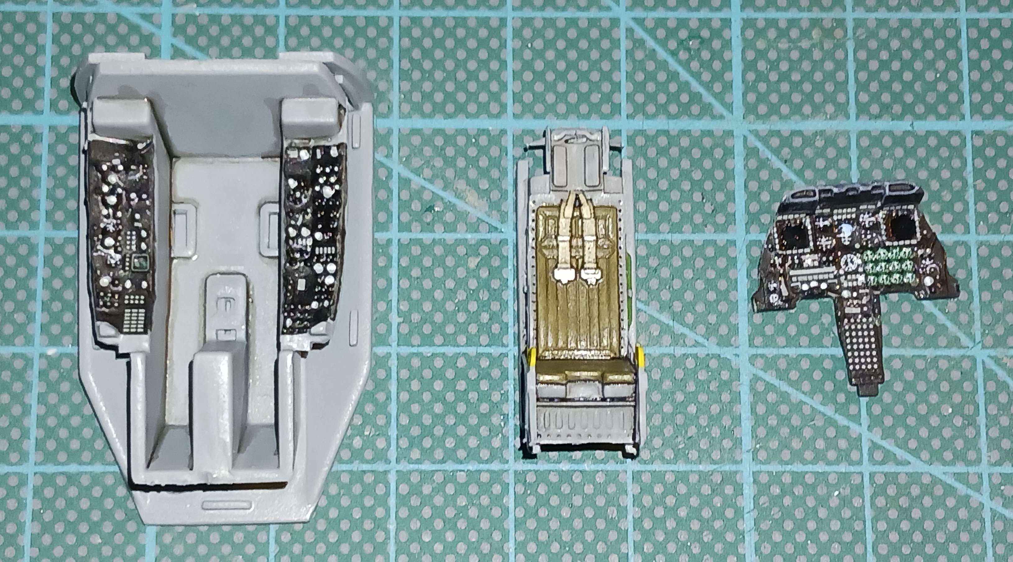 Hallo, bei mir gibt es kleine Fortschritte. Das Cockpit ist soweit fertig. Die Declas für das Armaturenbrett und die Seitenkonsolen waren extrem dünn, dadurch haben sie sich wunderbar in die Vertiefungen des Reliefs gelegt (unter Zuhilfenahme von Tamiya Mark Fit Super Strong).