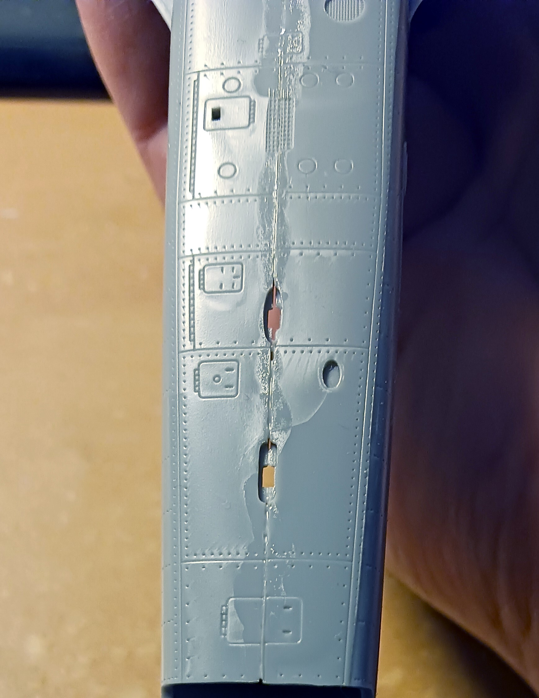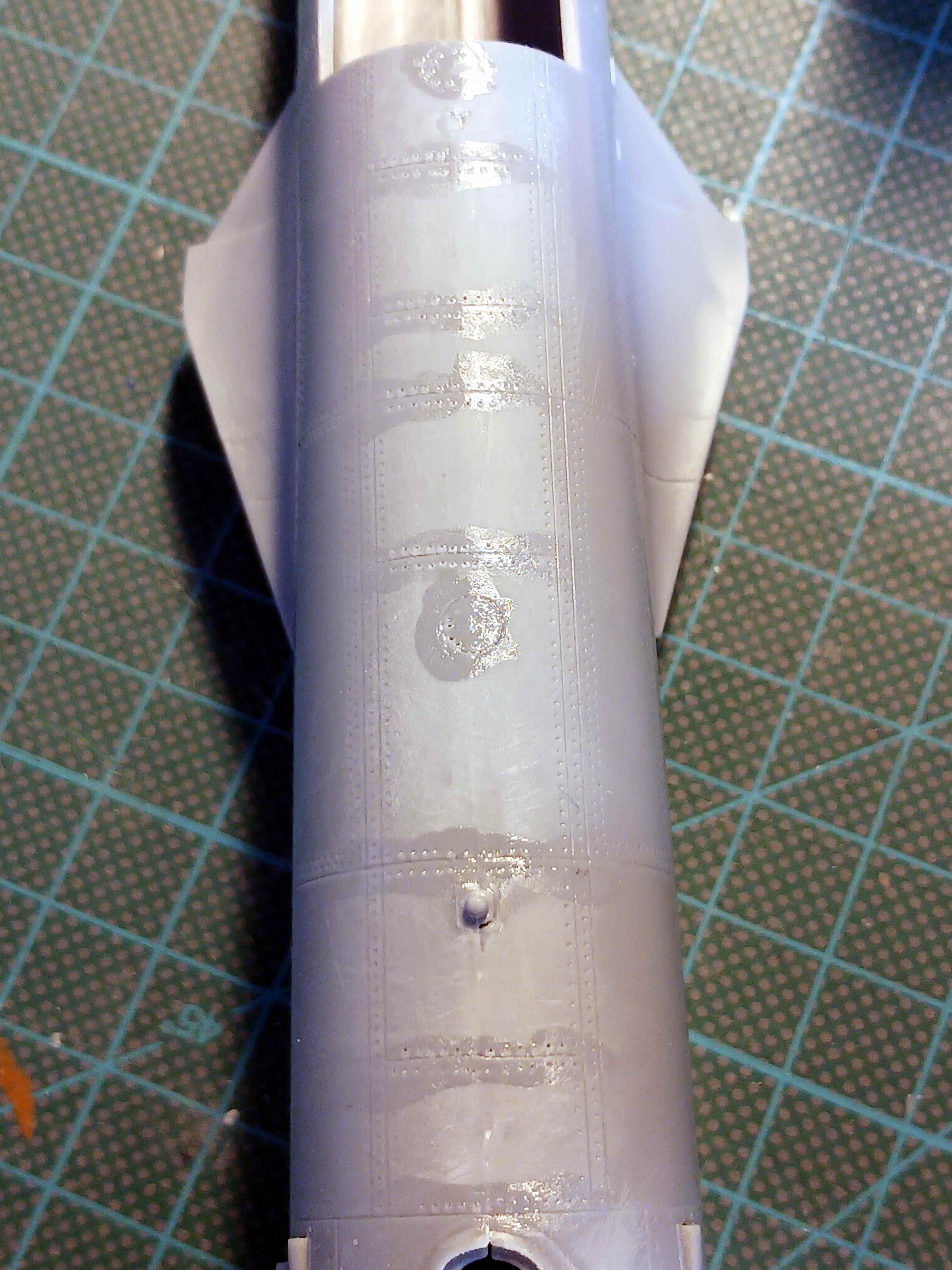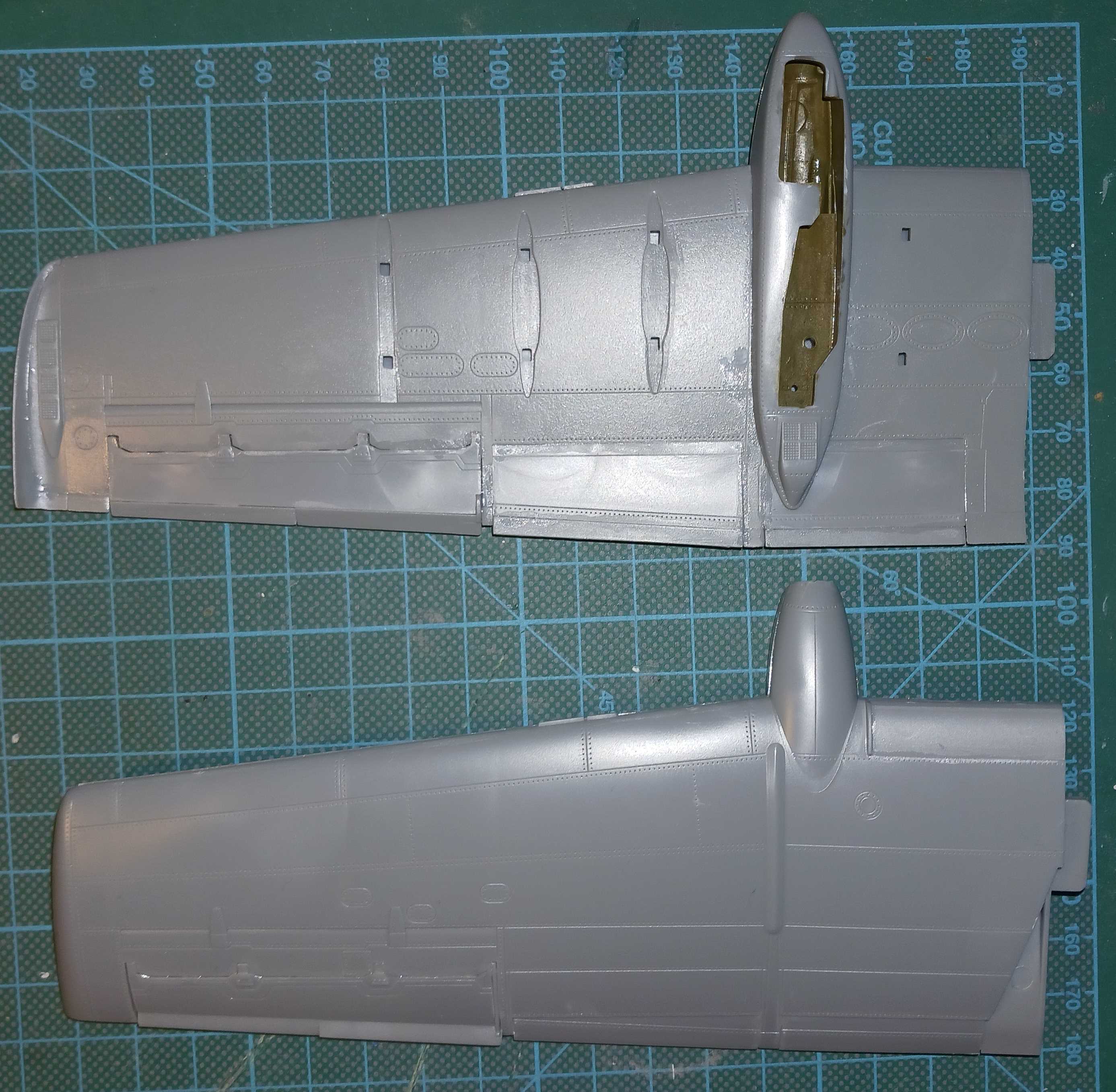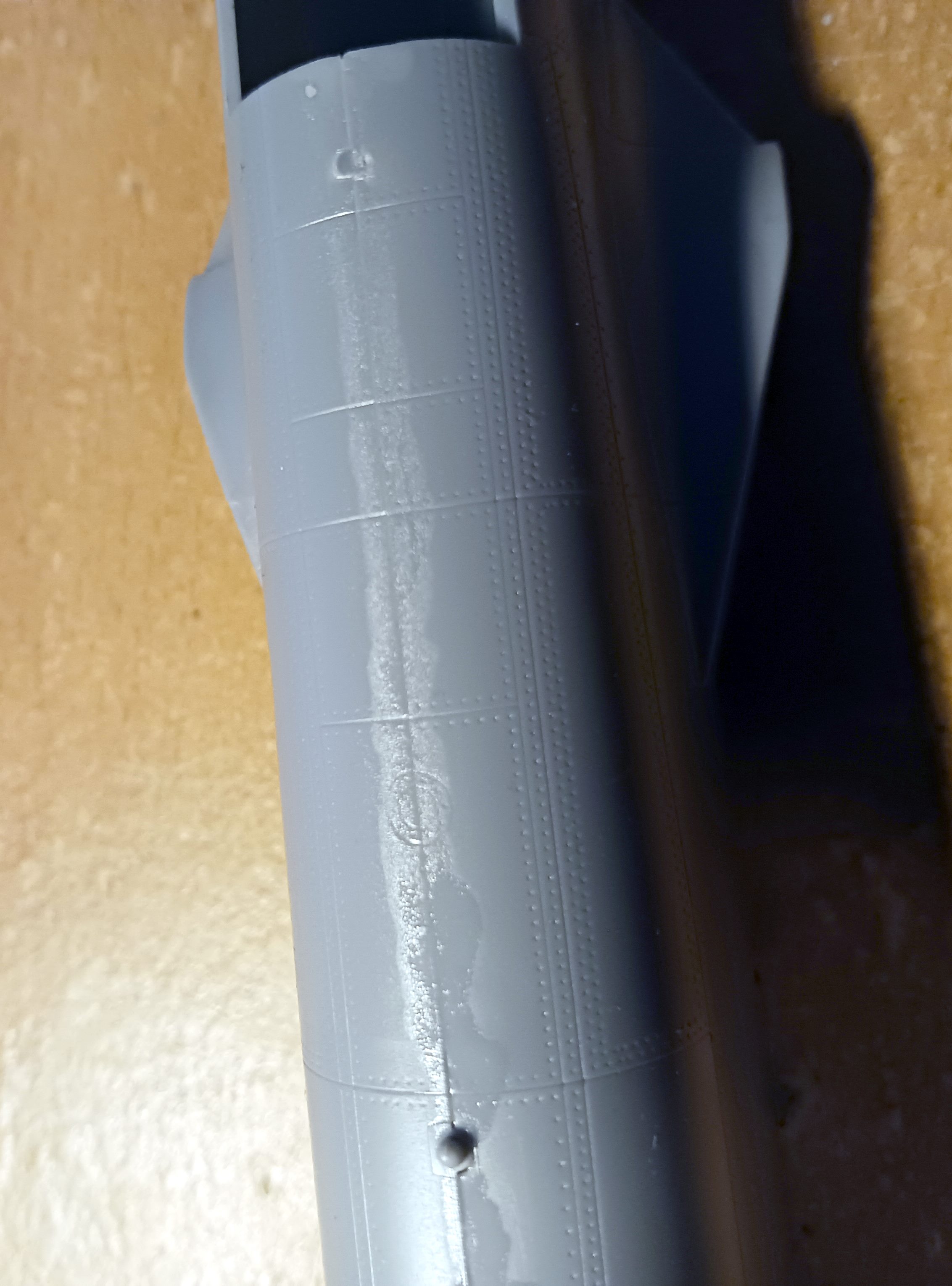 Nach einer etwas längeren Pause geht es auch bei mir endlich weiter. Nachdem ich die beiden Rumpfhälften verklebt hatte, hat sich gezeigt, dass auf der ganzen Länge die Klebenaht verschliffen werden musste.