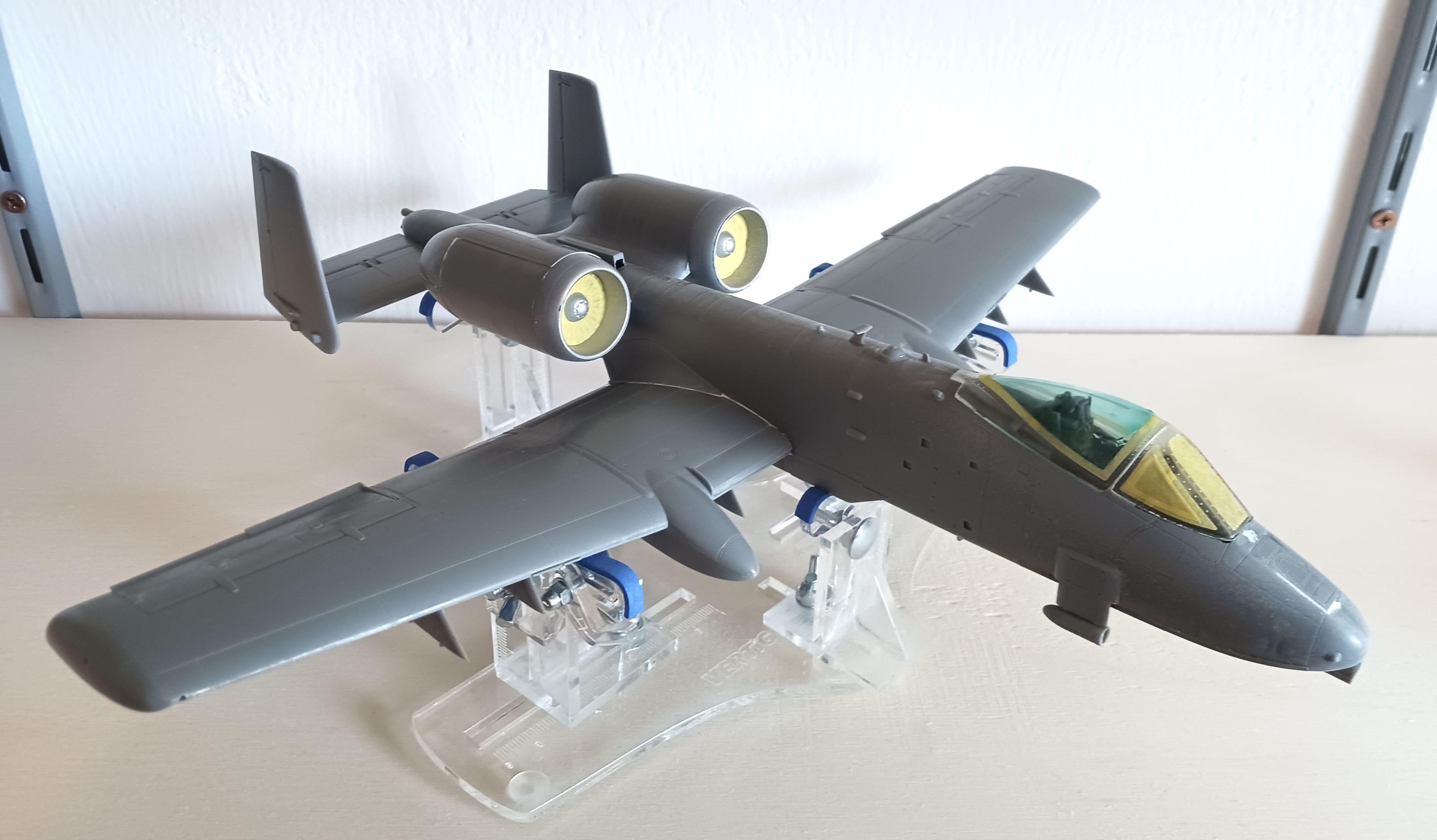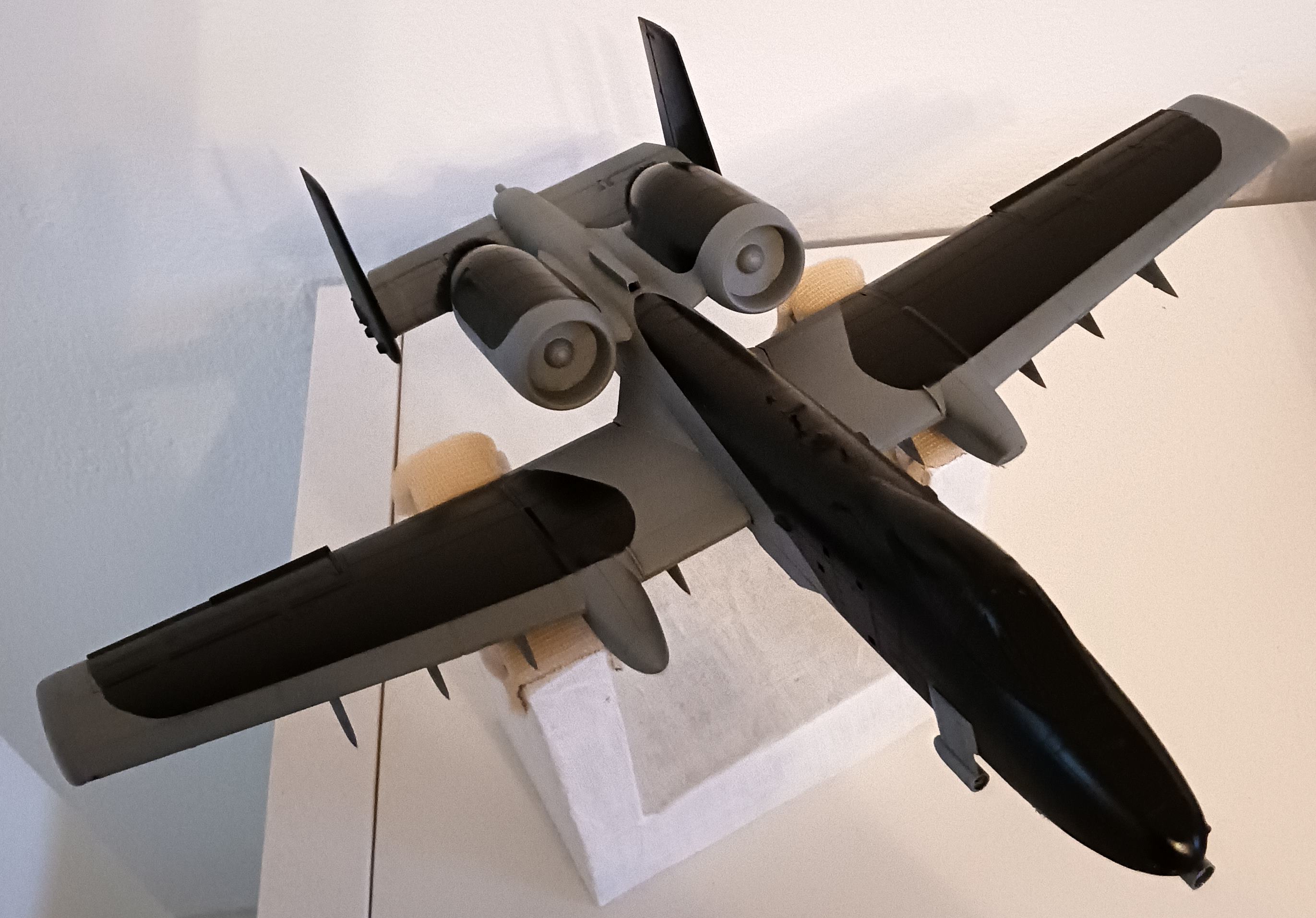 ja, anfangs hatte ich auch mit dem Gedanken gespielt, die GAU-8 Avenger in einem kleinen Diorama neben dem Flugzeug zu positionieren, mit einen VW Käfer als Größenvergleich (wie auf dem Foto: https://de.wikipedia.org/wiki/GAU-8/A_A ... Type_1.jpg ). Aber inzwischen ist sie schon auf Nimmerwiedersehen im Rumpf verschwunden.