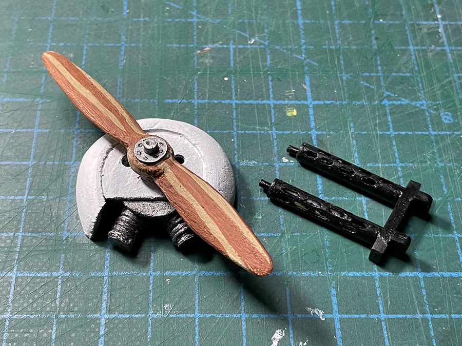 Die Motorhaube und der Propeller sind aus Balsaholz entsprechend ausgesägt und zugeschliffen worden.