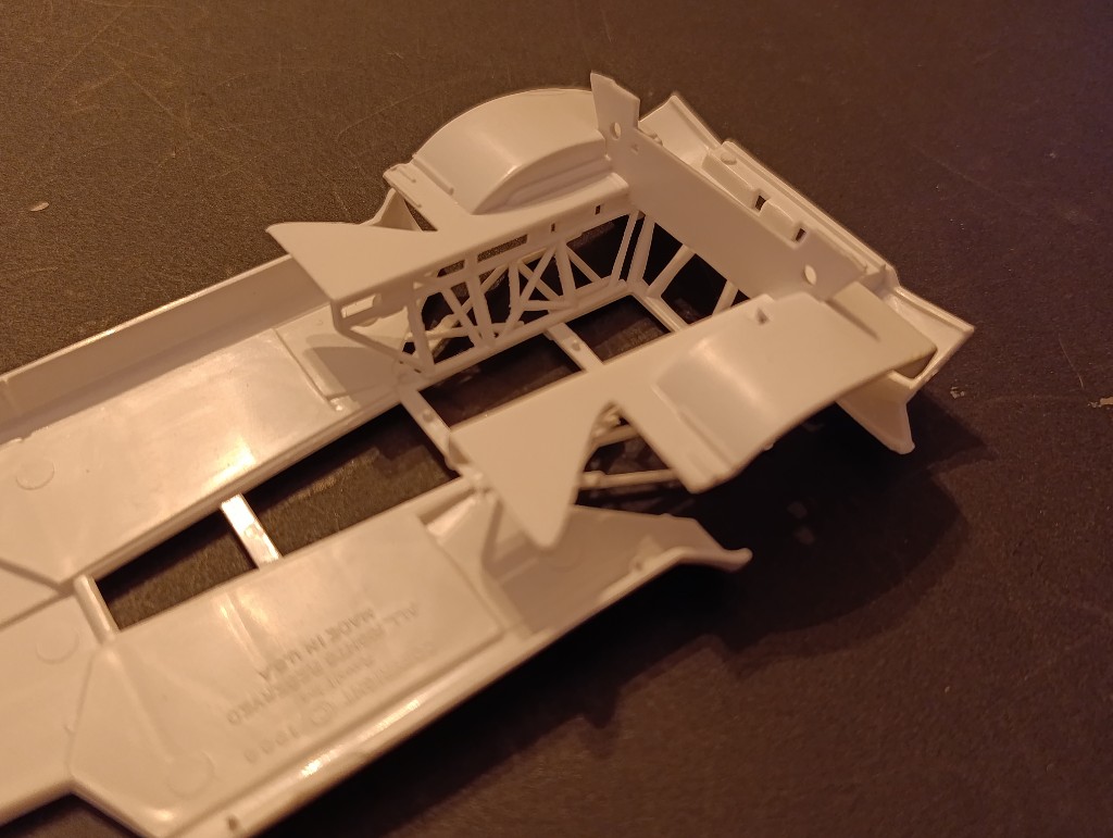 Die Unterseite haben wir dann hier. Man sieht die geteilte Karosserie.