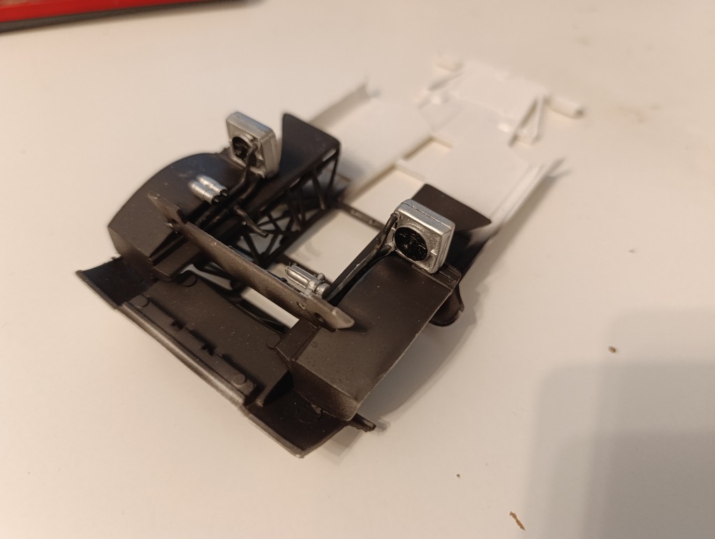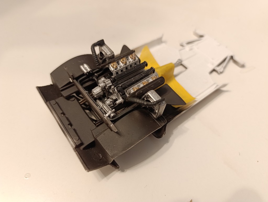 Am Lamborghini habe ich auch ein paar Fortschritte gemacht. So habe ich den Motorblock eingesetzt, leider war der Unterboden etwas verbogen, also musste ich hier mit Tape nachhelfen