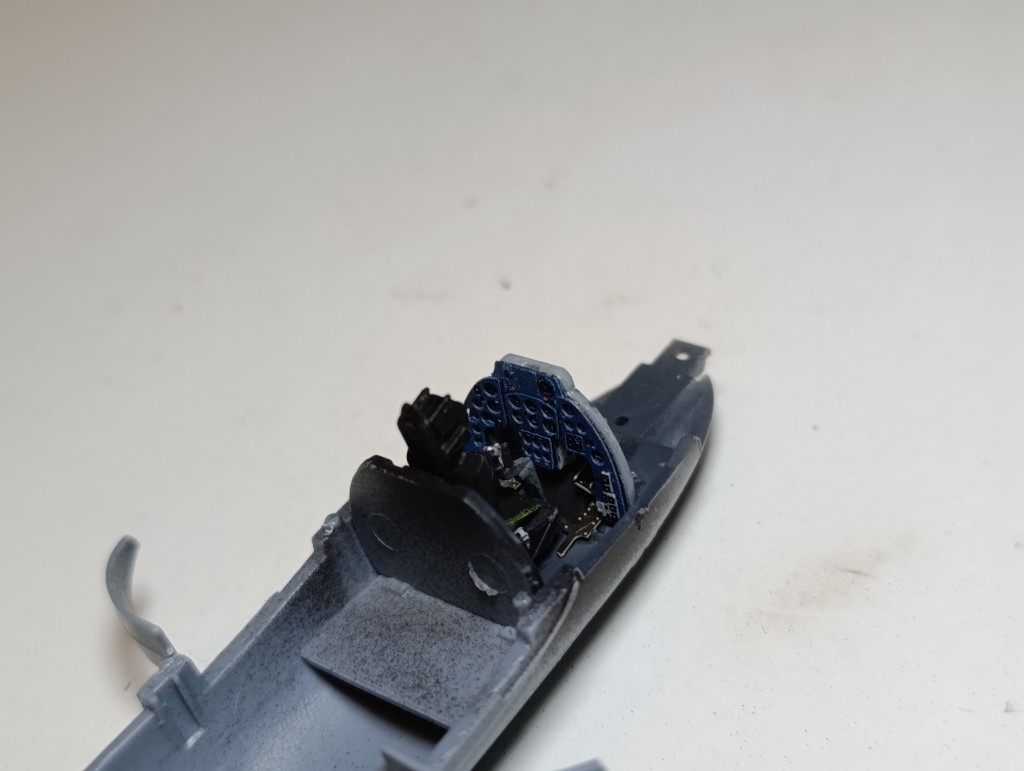 Jetzt folgten einige PE-Teile, welche ich leider versäumt habe abzulichten. Aber einige Steuerkonsolen und Instrumente wurden verbaut, ebenso neue Seitenruderpedale und das Instrumentenbrett wurde entsprechend versehen.