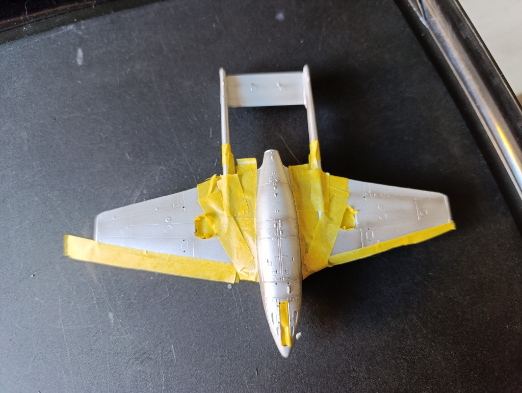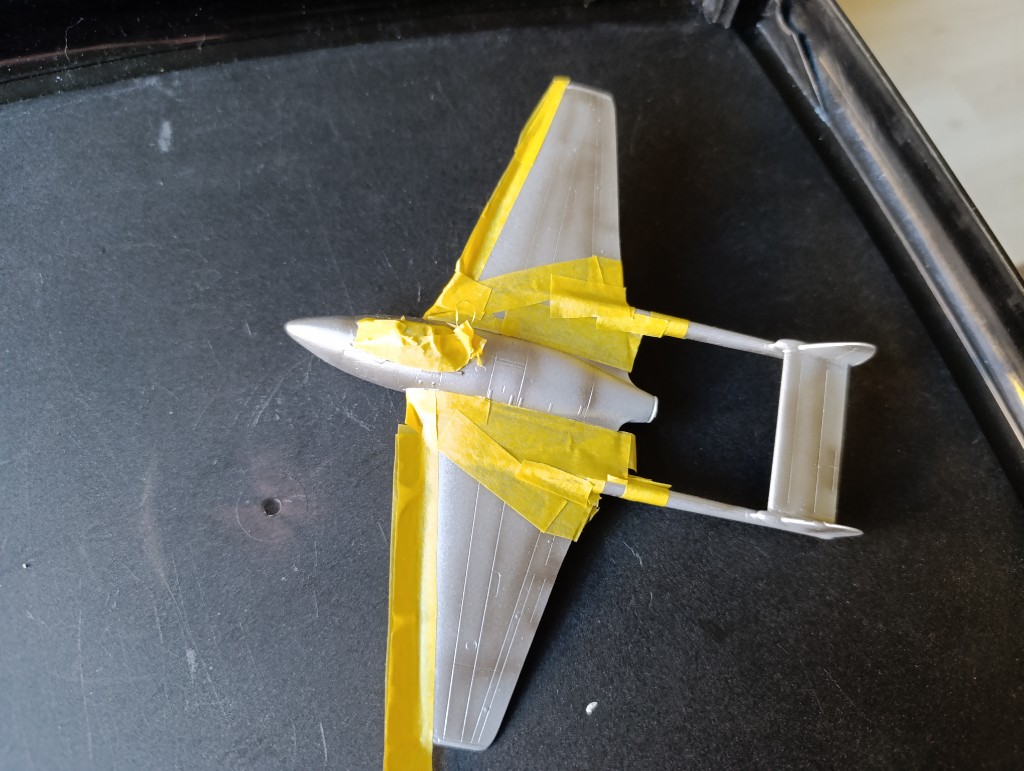 . Dann habe ich das Flugzeug vollständig mit Metallfarben gesprüht. Nun ging die Abklebenorgie los und ich selbst hatte auch wirklich Respekt davor, da so eine Lackierung zwingend sauberes Arbeiten erfordert.
