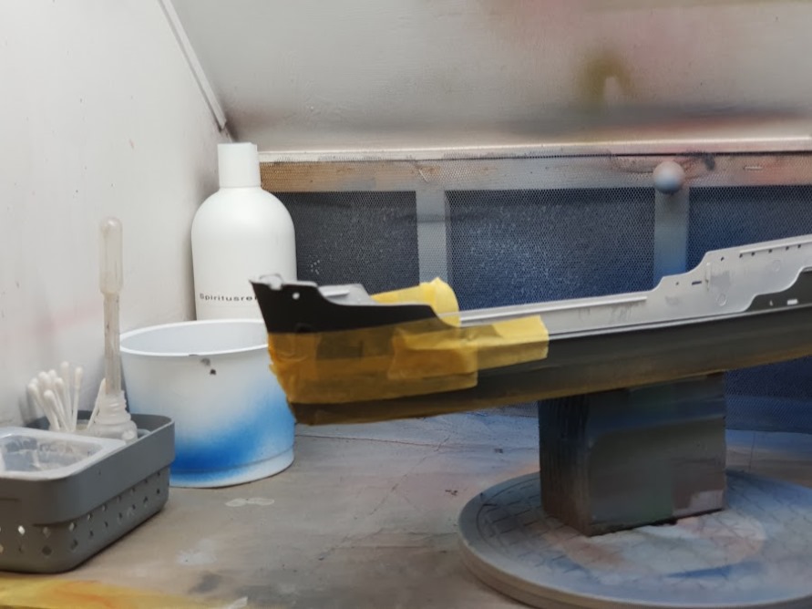 Der Rumpf hatte seine Grundfarben ja schon erhalten. Als erstes bekam er einen weiteren Überzug mit mattem Klarlack. Die nächsten Schritte waren: