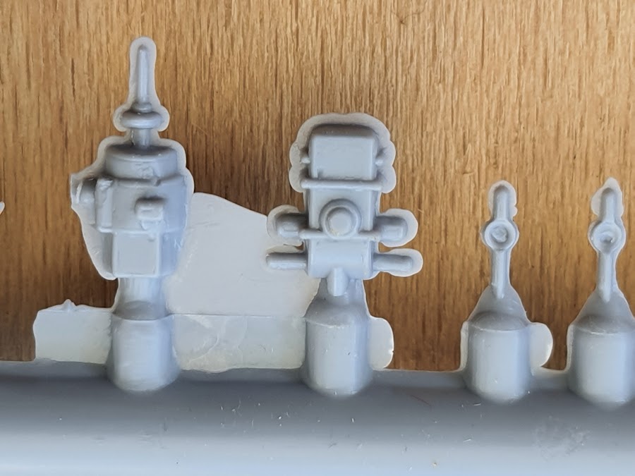 Ich habe noch nie mit soviel „Unlust“ an einem Modell gearbeitet wie an diesem. Die Druckqualität, speziell der Kleinteile, ist so schlecht, dass so gut wie jedes Kleinteil geschliffen und gespachtelt werden muss. Vom entfernen der Fischhäute will ich hier gar nicht erst anfangen.