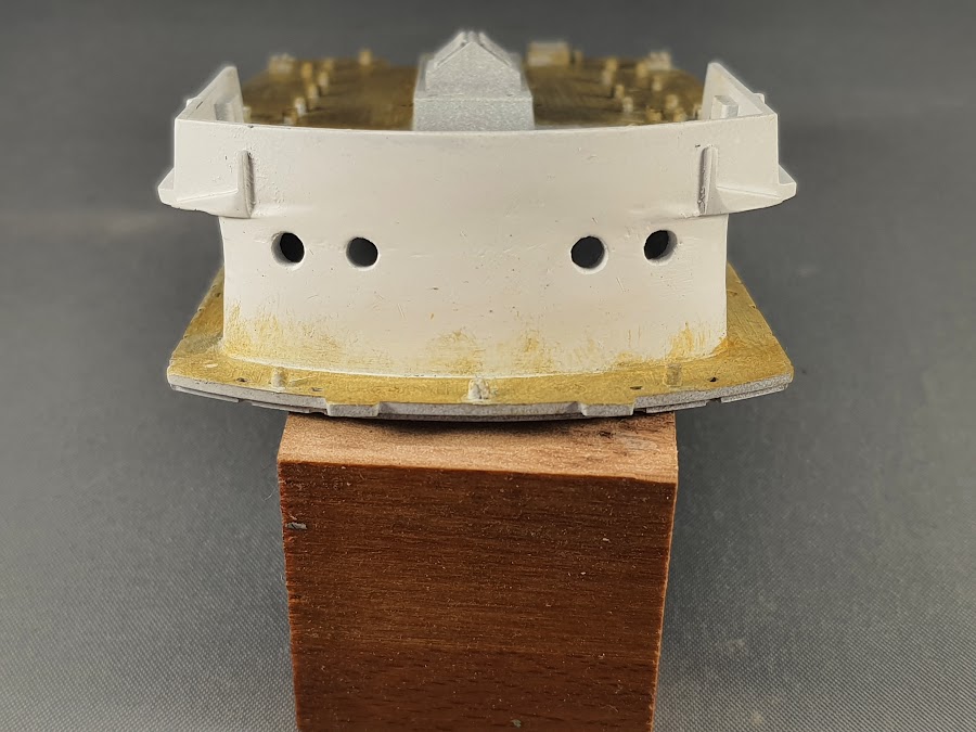 Der hintere Aufbau ist mittlerweile auch zusammengeklebt. Die Bullaugen waren ja leider nicht passgenau übereinander zu bringen. Die Lösung war, beide Teile durch schieben zu „vermitteln“ und die Bullaugen vorsichtig nach zu bohren, also leicht zu vergrößern. Der Überstand, der oberen Hälfte der Front, wurde verschliffen und verspachtelt.