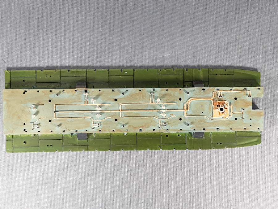 Die Gebrauchs- und Alterungsspuren auf dem Haupt bzw. Tank Deck wurden ebenfalls mit verschiedenfarbigen „Rost washes“, diesmal mit dem Pinsel aufgetragen und mit Pastellkreide