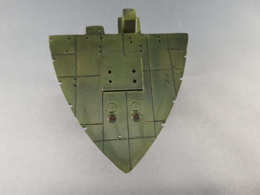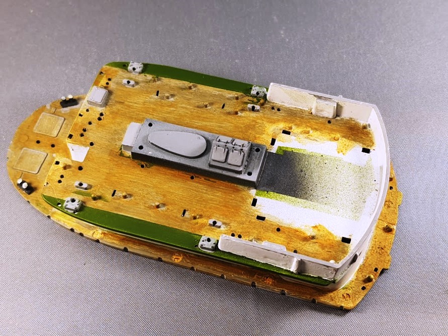 Die Bearbeitung des hinteren Aufbaus war bisher der Teil des Baus, der am Zeit intensivsten war. Weil die Bullaugen je zur Hälfte im Unterteil, und im Oberteil saßen musste ich die Bullaugen ein wenig vergrößern um die Rundungen übereinander zu bringen. Da die Vorderfront ebenfalls einen Versprung hatte musste einiges an Material abgetragen, anschließend verspachtelt und geschliffen werden.