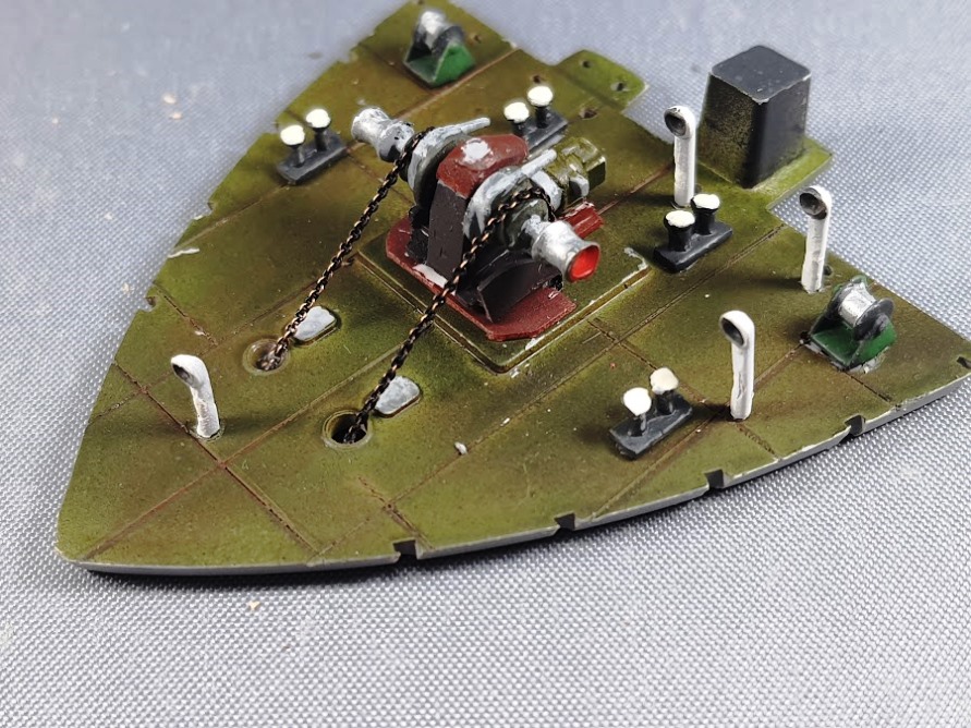Das Vordeck wurde mit Lüftern, Pollern und der Ankerwinde bestückt. Die beiliegenden Plastikketten wurden durch eine feine Metallkette ersetzt.