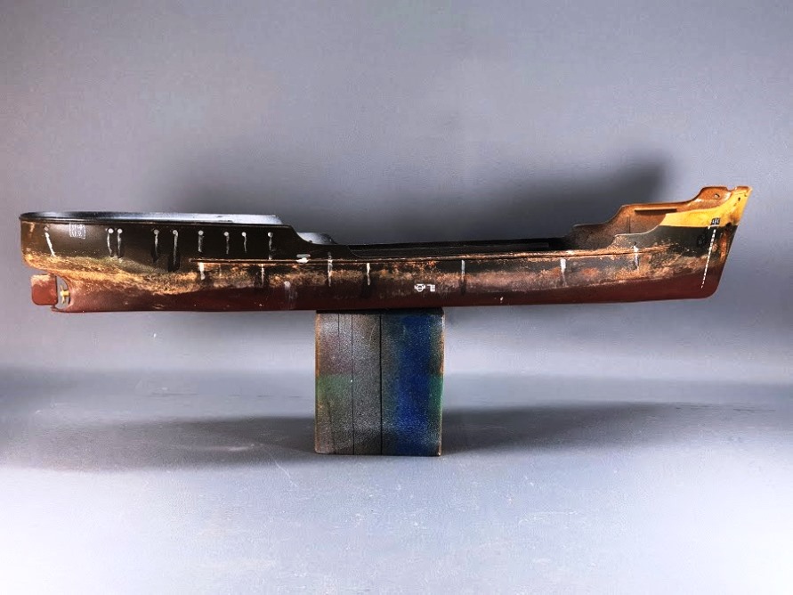 Die Wände des Rumpfes weisen eine Dicke von etwa 2 Millimetern auf, Der Aufbau kommt sogar auf eine Wandstärke von 3 Millimetern. Fischhäute überall und Krater Tiefe Auswerfer Marken. Die Reling ist total verbogen.