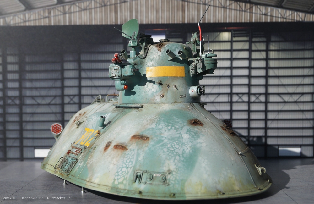Gefällt mir sehr gut, besonders die 'ausgewaschenen' Farben, und sogar mit maßstabsgerechtem Hangar! Da bekommt man direkt Lust sich auch mal an sowas auszutoben. Aus reiner Neugier: wie sieht denn das Modell von unten aus, ist das innen hohl oder sind da irgendwelche Triebwerke o.Ä. drunter?