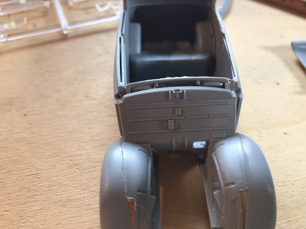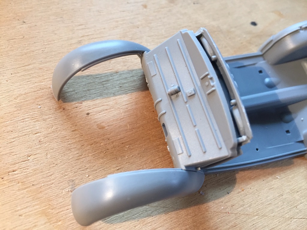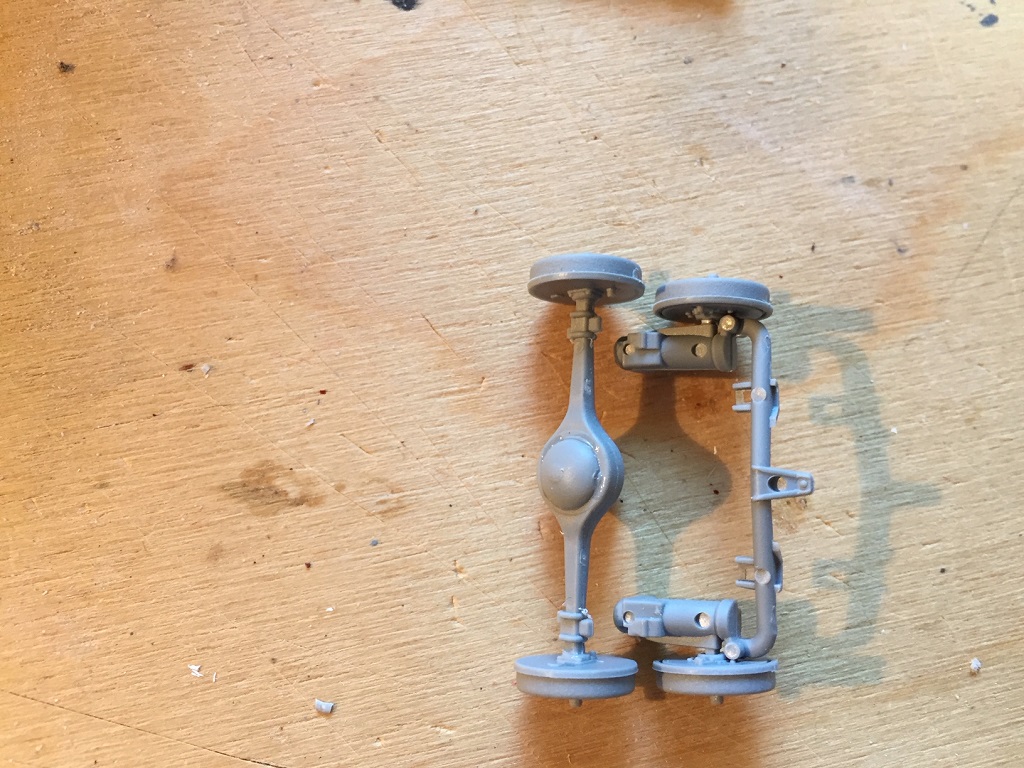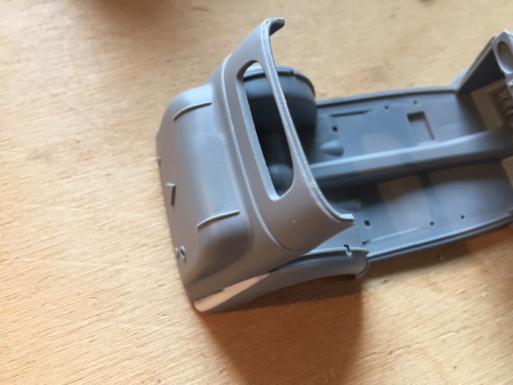 Die Karosserie ist in zu viele Teile aufgeteilt, was zu verschleifende Klebestellen erfordert, und das Plastik ist ziemlich dick. Da war man bei anderen Herstellern vor Jahrzenten schon viel weiter. Fahrgestell, Bodenplatte mit Kotflügeln, Karosserie, ferig.