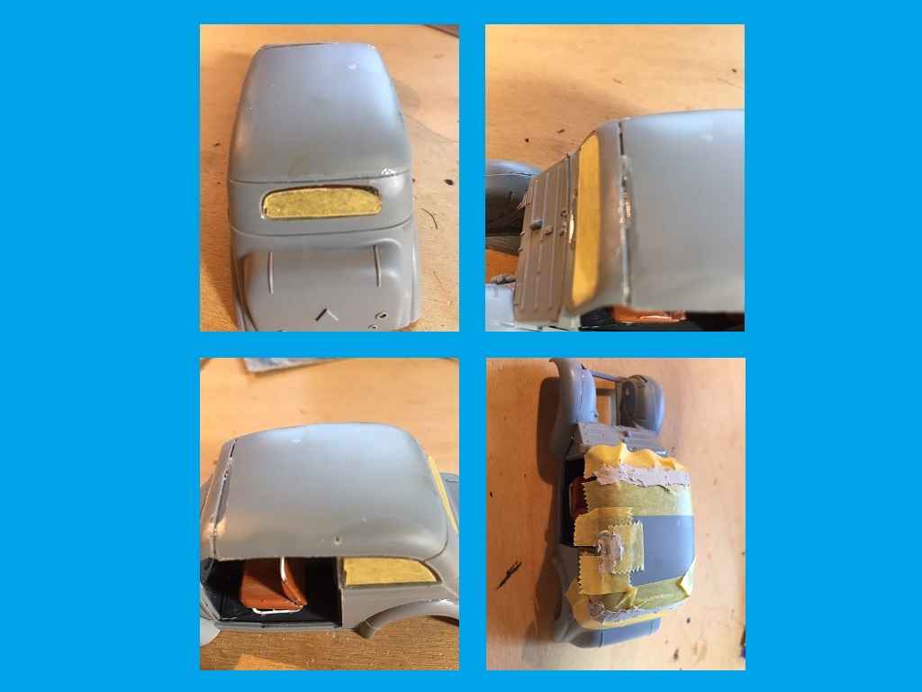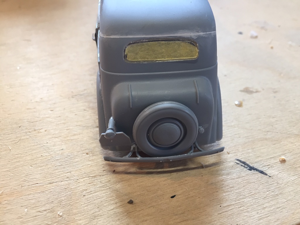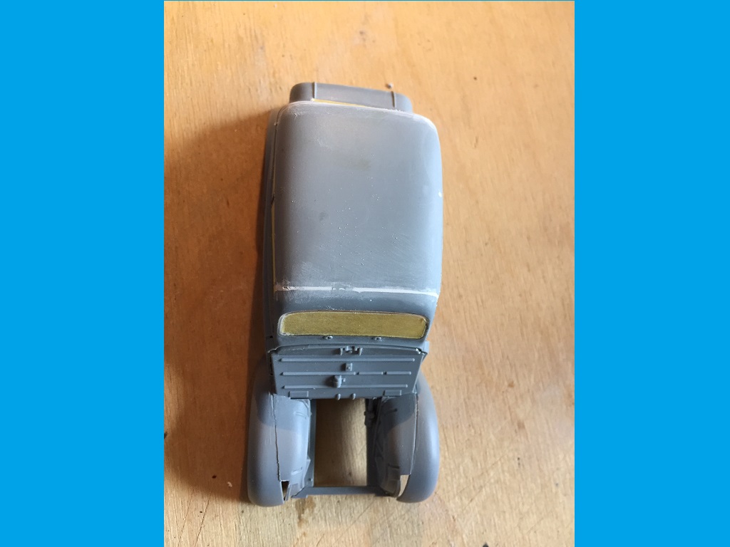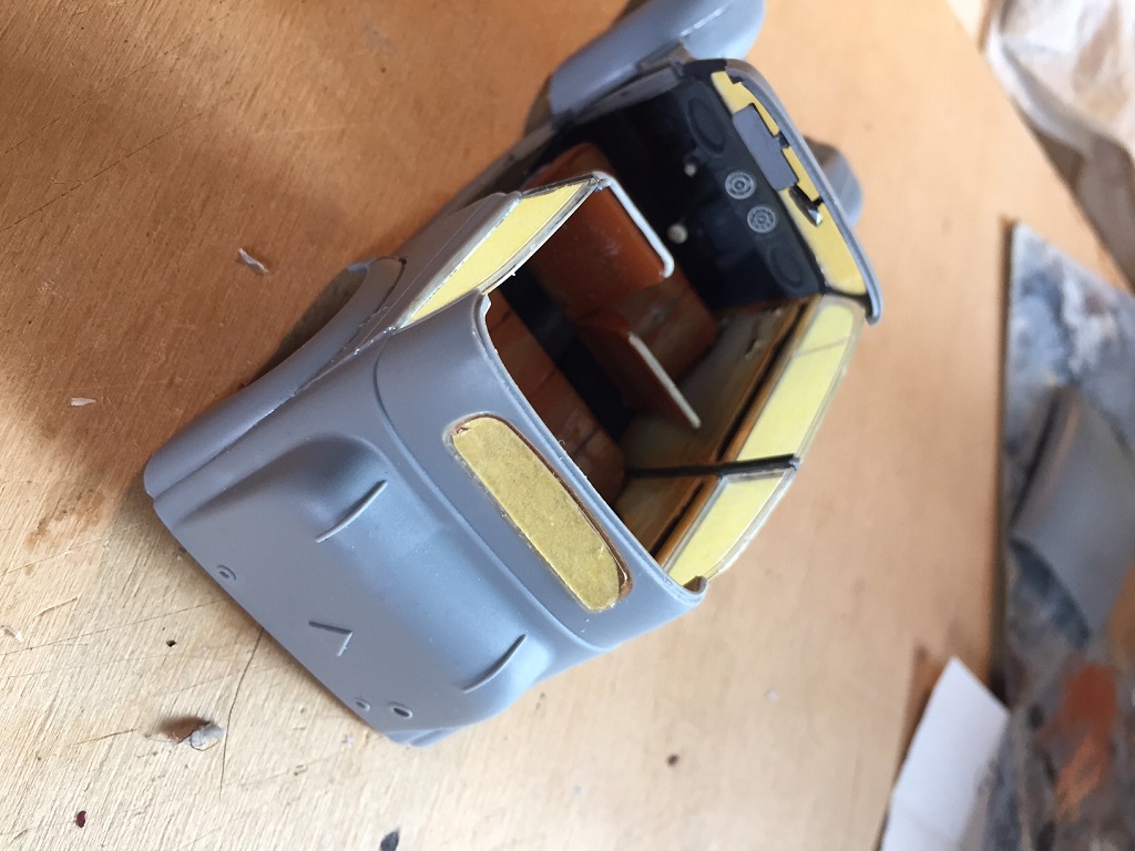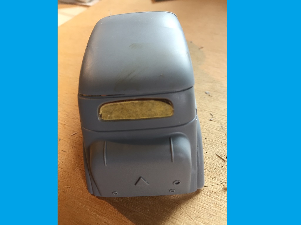 Ja Bert mit dem Ast im Bohrloch wäre auch gut gewesen. Als Spachtel nehme ich immer den von Revell, habe ich noch nie Probleme mit gehabt. Bei der Rückscheibe habe ich mehr Angst das sie beim schleifen zerkratzt. Deshalb noch einmal abgeklebt.