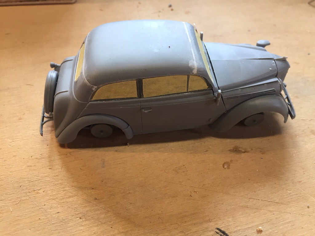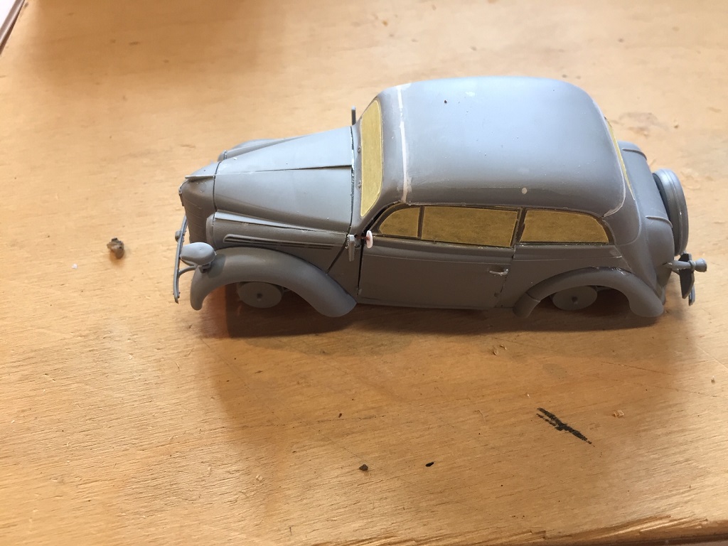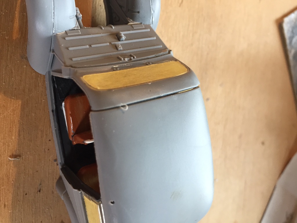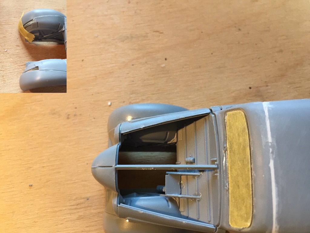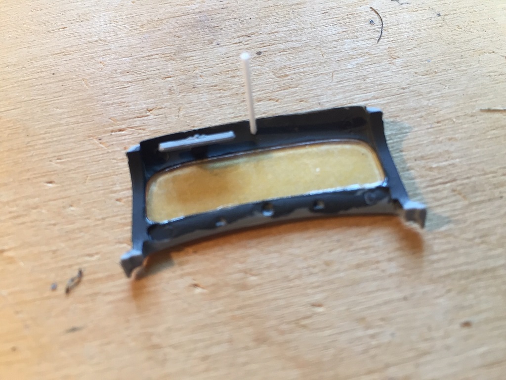 Ja Bert mit dem Ast im Bohrloch wäre auch gut gewesen. Als Spachtel nehme ich immer den von Revell, habe ich noch nie Probleme mit gehabt. Bei der Rückscheibe habe ich mehr Angst das sie beim schleifen zerkratzt. Deshalb noch einmal abgeklebt.