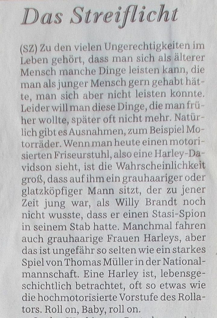 Im "Streiflicht" der Süddeutschen Zeitung wurden/werden auf hintersinnige Art oft aktuelle Themen angesprochen. Manche habe ich mir ausgeschnitten und aufbewahrt, so z.B. die Anmerkungen zur Beliebtheit von Tieren. (Die arme Küchenschabe, sie belegt immer den letzten Platz.)