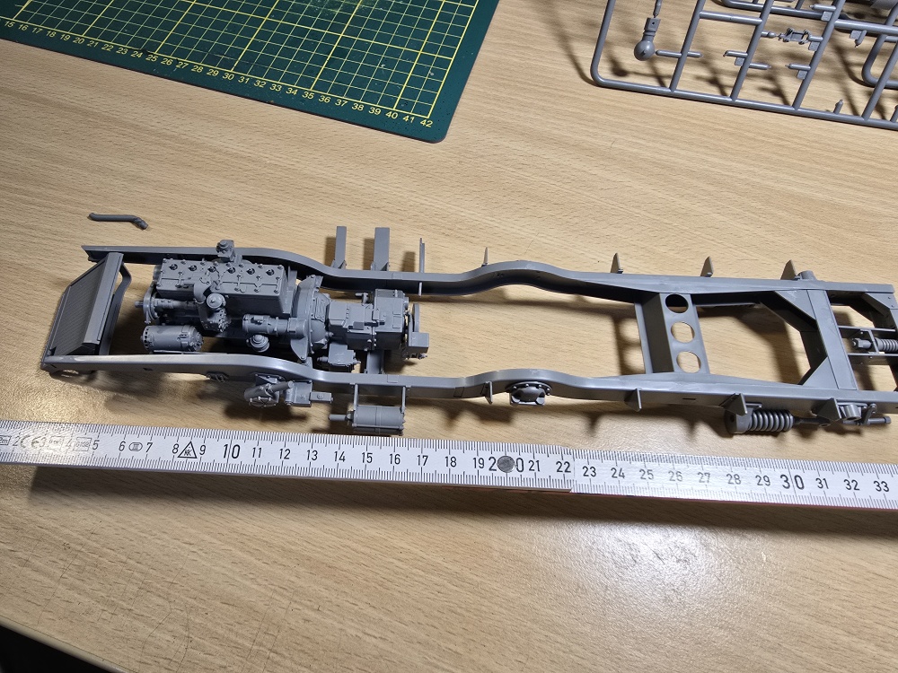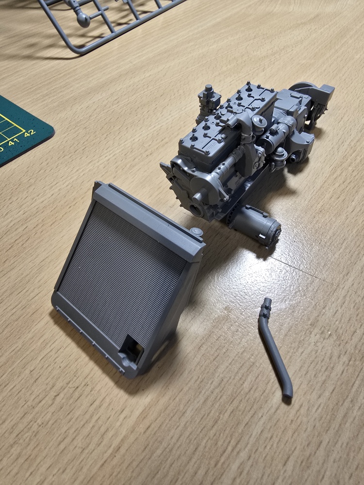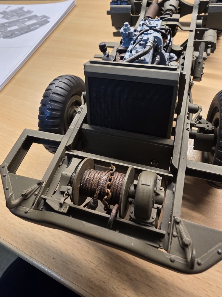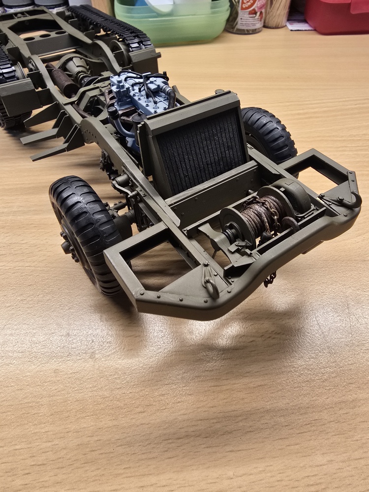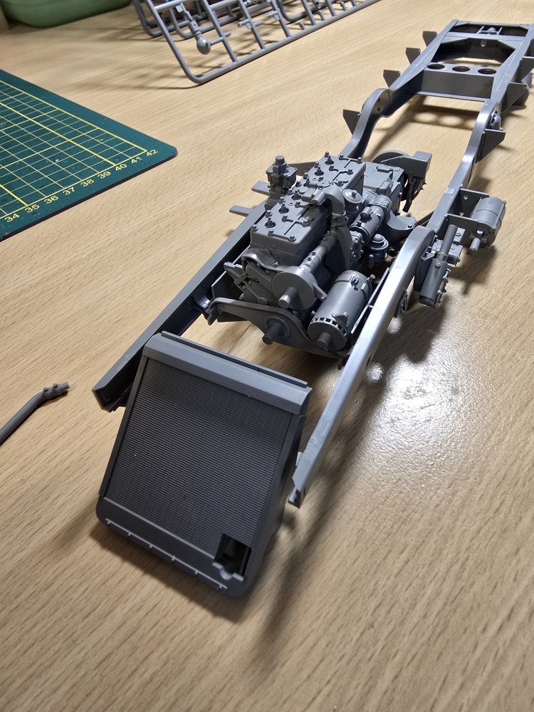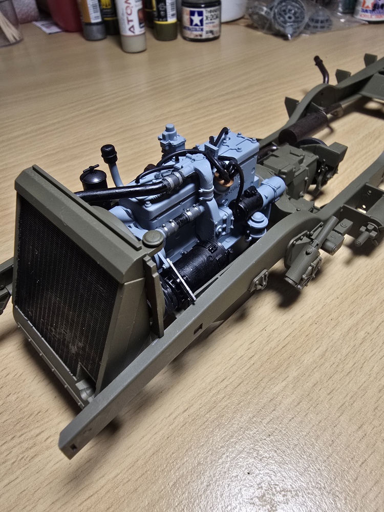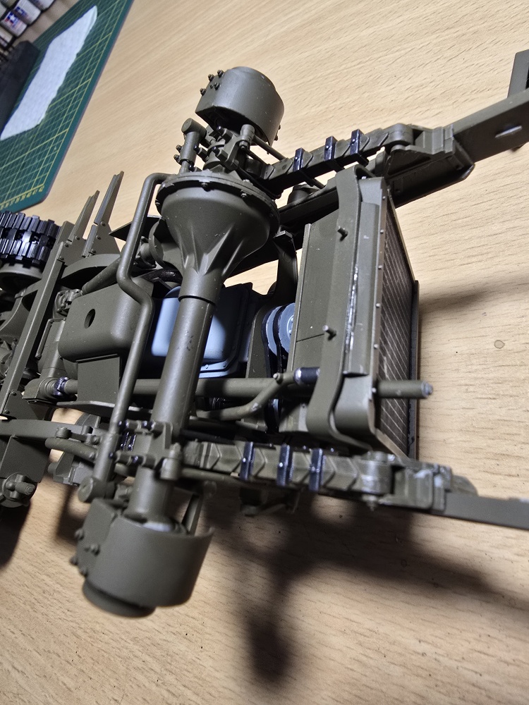 Nachdem ich dann den Fahrzeugrahmen sowie auch den Kühler in Olive Drab gebrusht habe , konnte das alles schon mal zusammen gebaut werden .