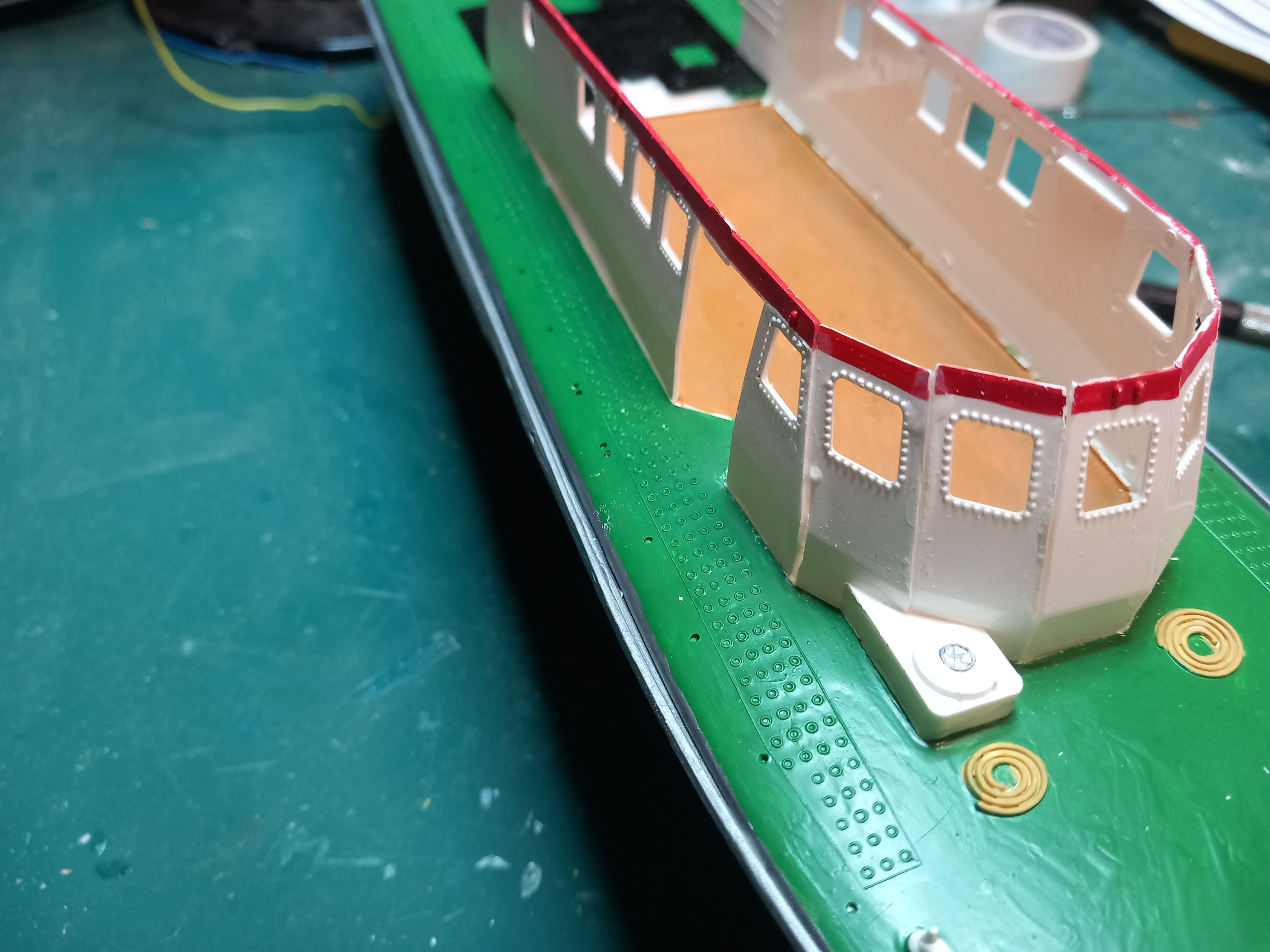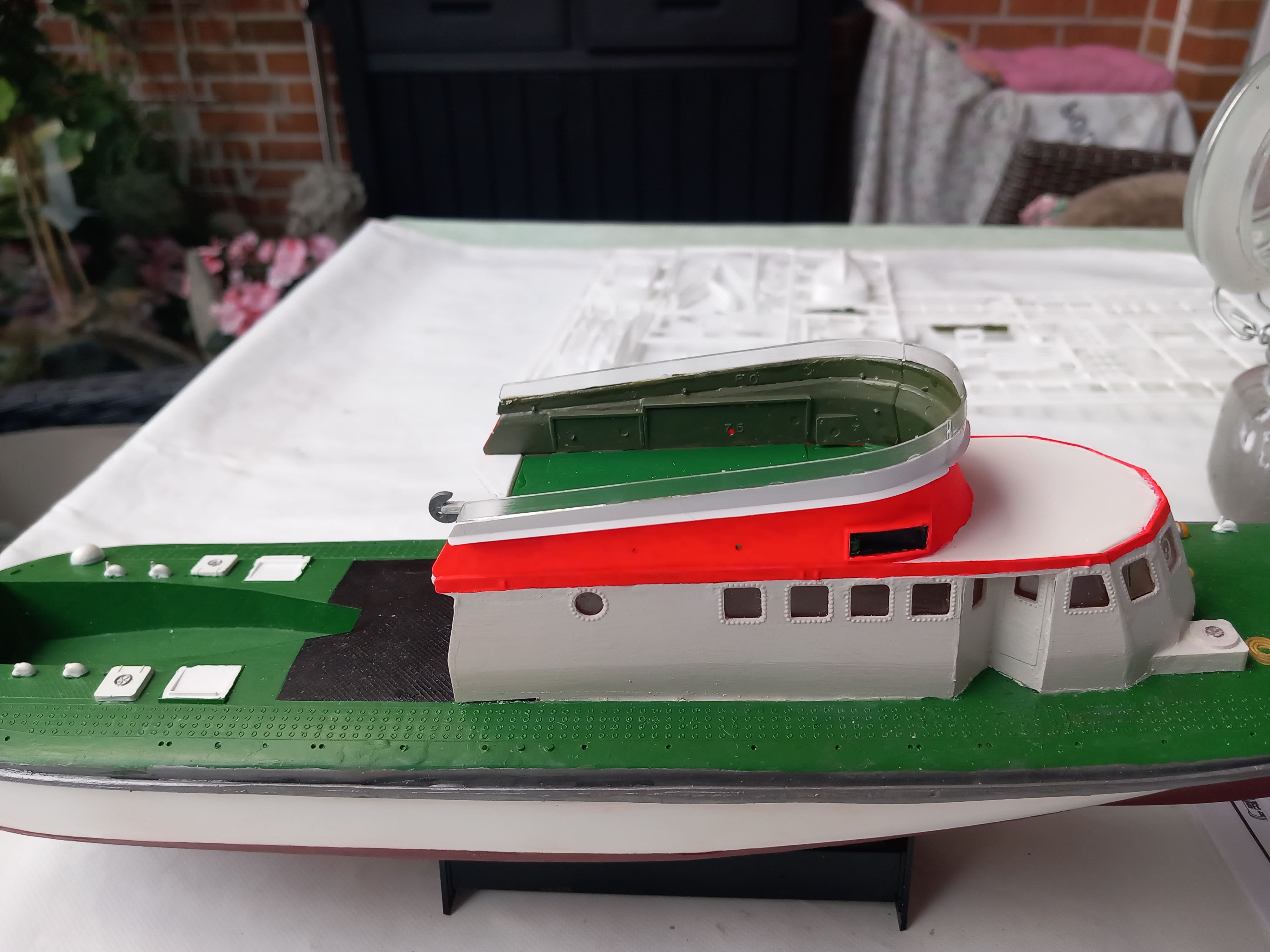 Moin. Es geht weiter mit dem Seenotrettungskreuzer. Das obere Deck wurde aufgesetzt und bemalt. Ein paar Anbauteile wurden am unteren Deck angebracht. Besonders problematisch ist das Aufsetzen der Plexiglasscheibe auf die obere Bordwand. Das Klarsichtteil ist völlig anders gebogen als die Bordwand und schließt auch längsseitig nicht vernünftig damit ab.