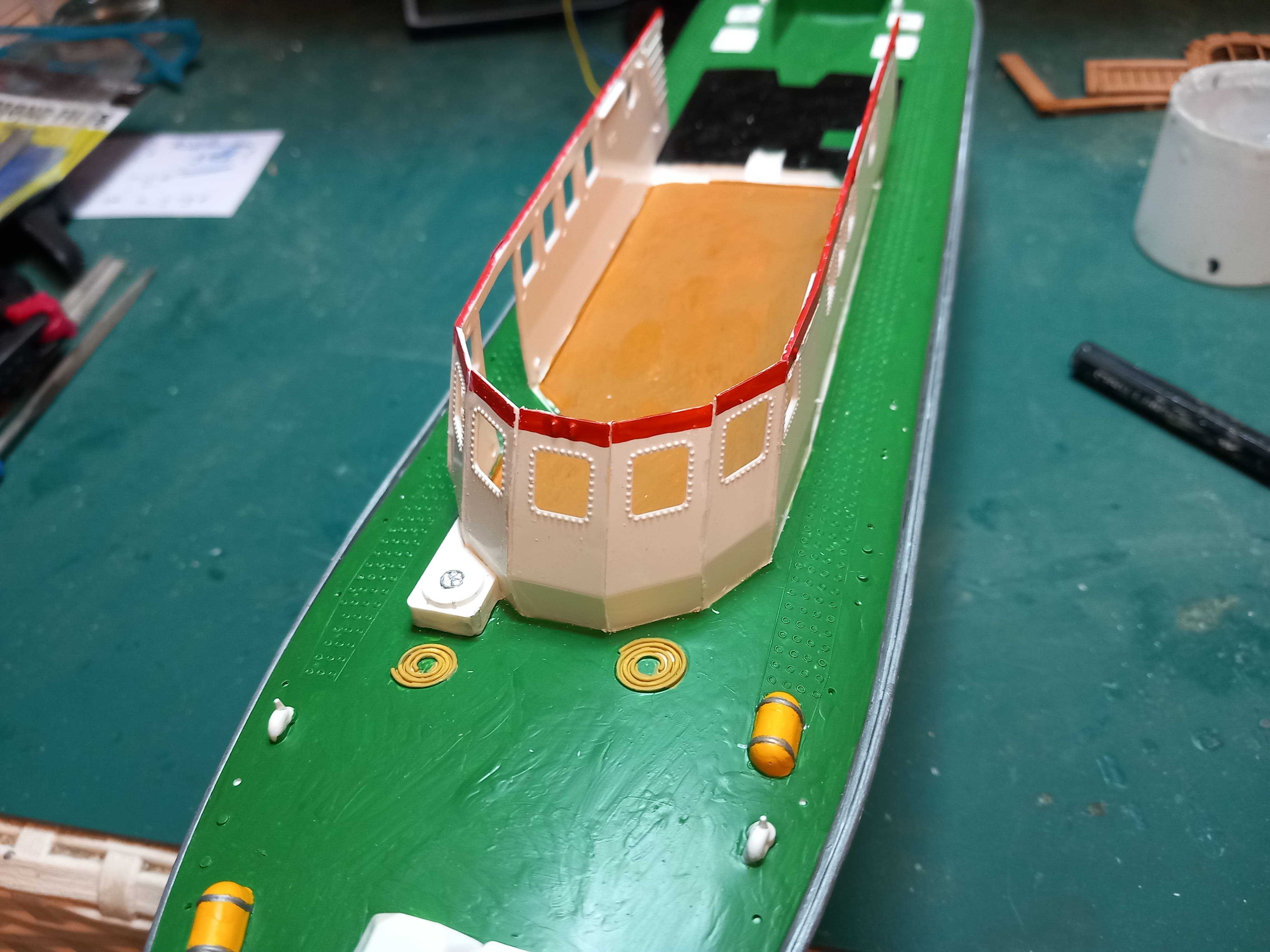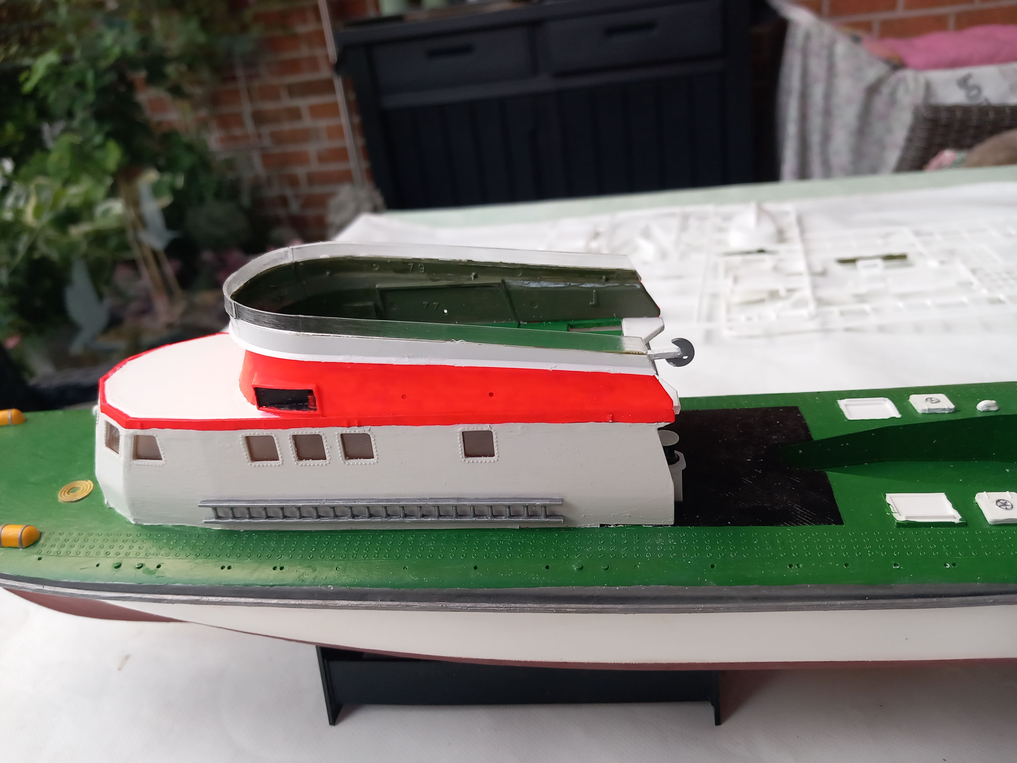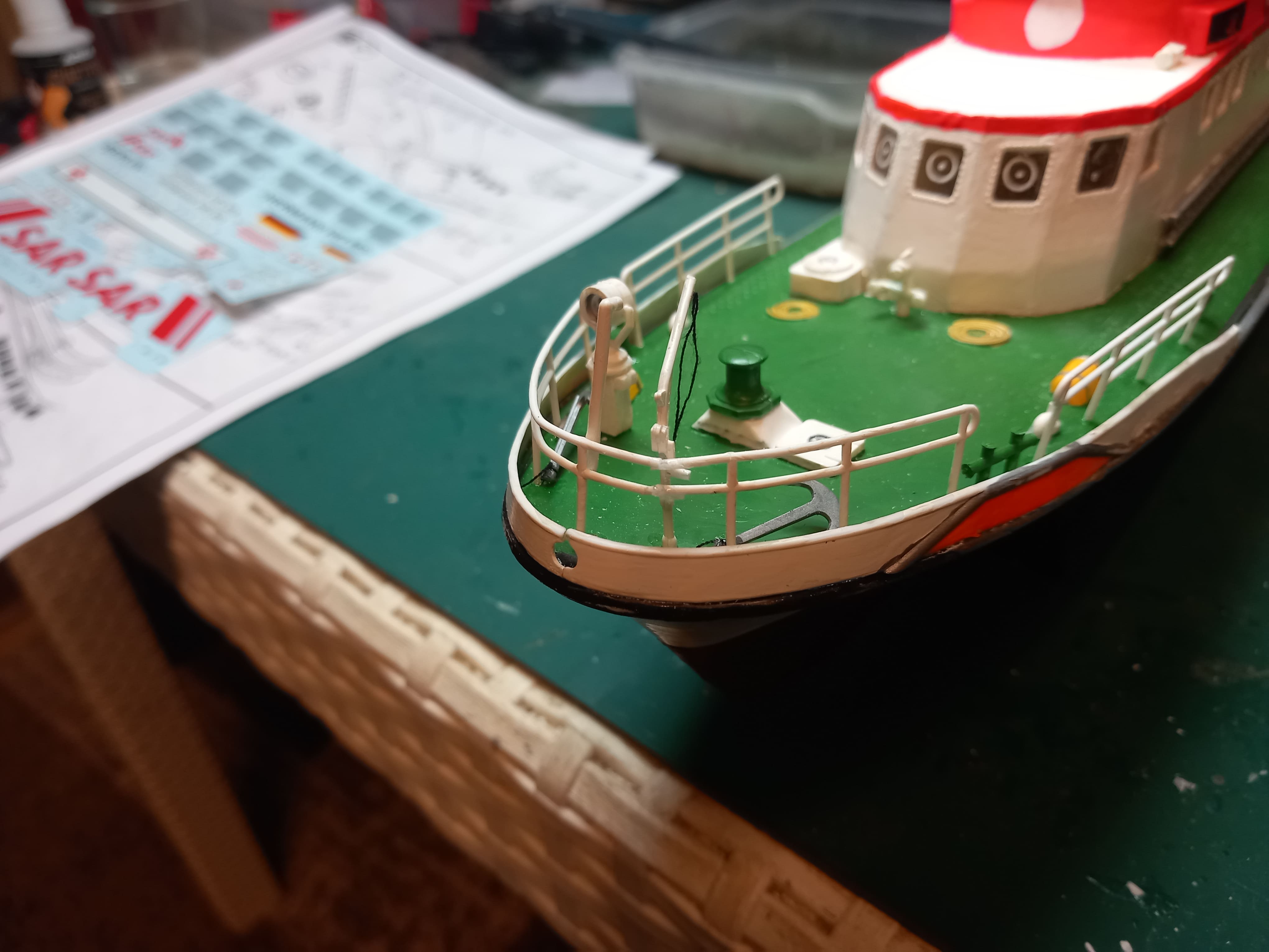 Langsam geht es voran mit der Berlin. Die vordere Reling, der Strahler, ein Kran und die Anker sind angebracht. Auch der Mast steht inzwischen. Leider bin ich die Hälfte der Zeit mit Ausbesserungsarbeiten beschäftigt, so habe ich beim mittleren Deck schon zum dritten Mal die weiße Farbe entfernt und neu aufgetragen. Auch beim Rumpf ist noch einiges auszubessern. Aber es wird. Gruß Ingo
