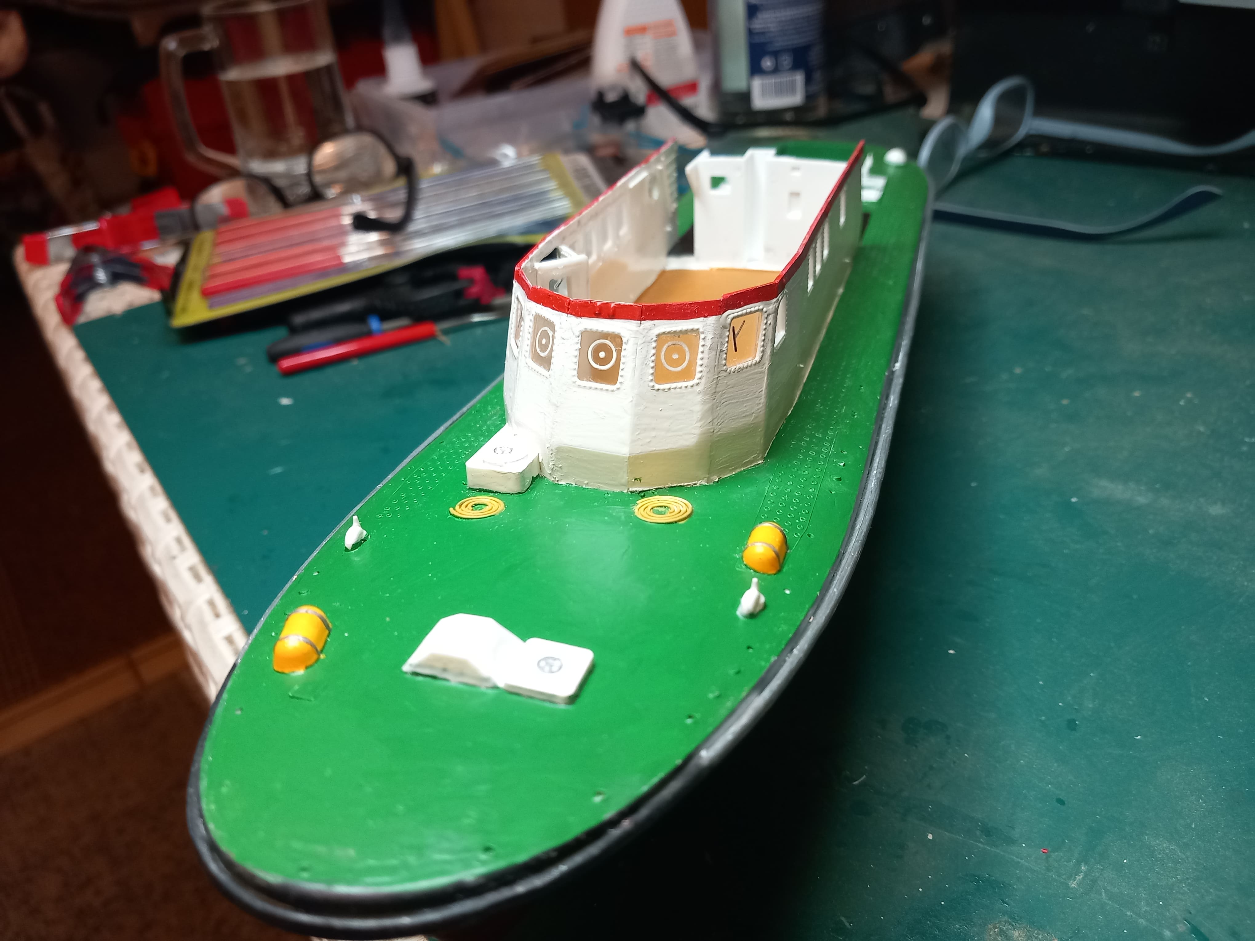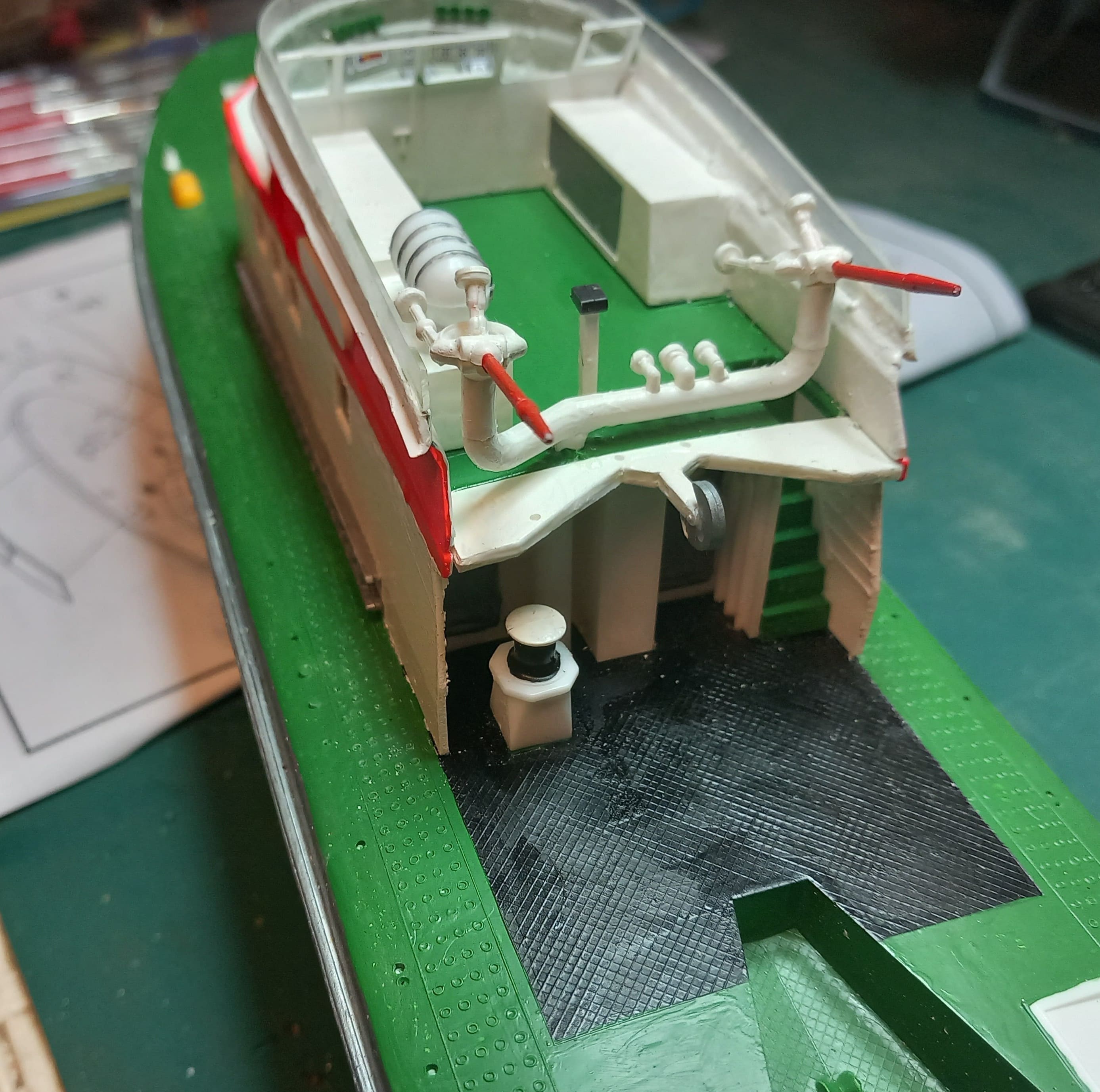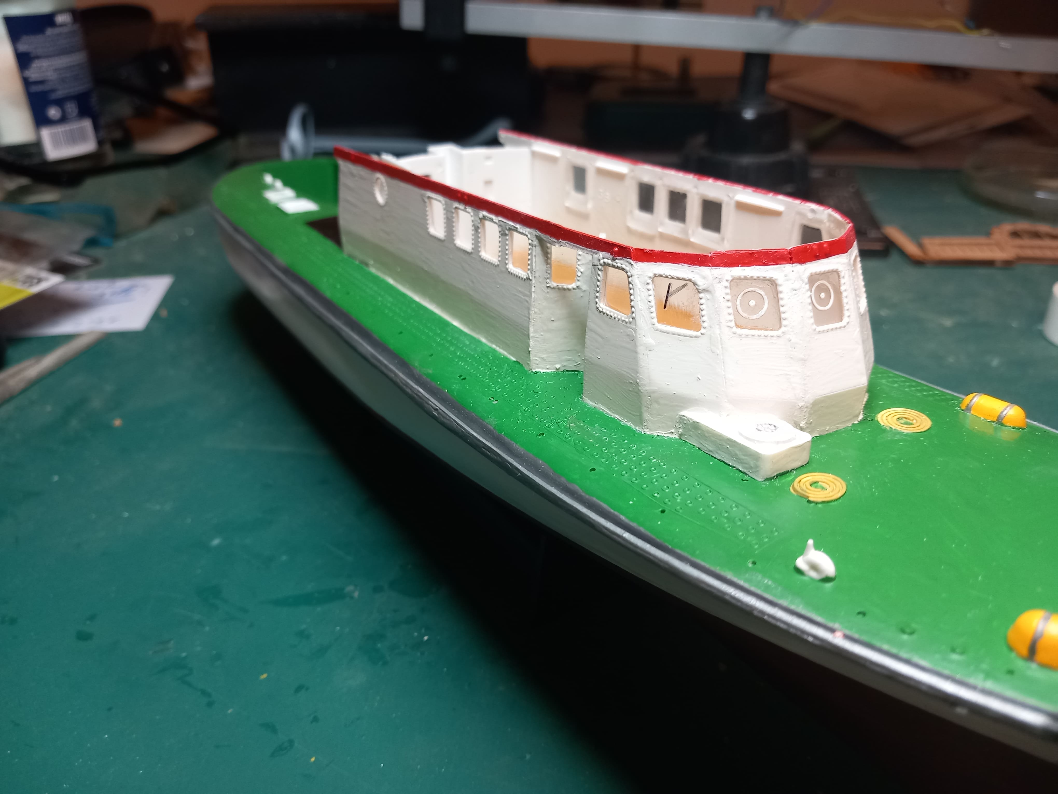 Langsam geht es voran mit der Berlin. Die vordere Reling, der Strahler, ein Kran und die Anker sind angebracht. Auch der Mast steht inzwischen. Leider bin ich die Hälfte der Zeit mit Ausbesserungsarbeiten beschäftigt, so habe ich beim mittleren Deck schon zum dritten Mal die weiße Farbe entfernt und neu aufgetragen. Auch beim Rumpf ist noch einiges auszubessern. Aber es wird. Gruß Ingo