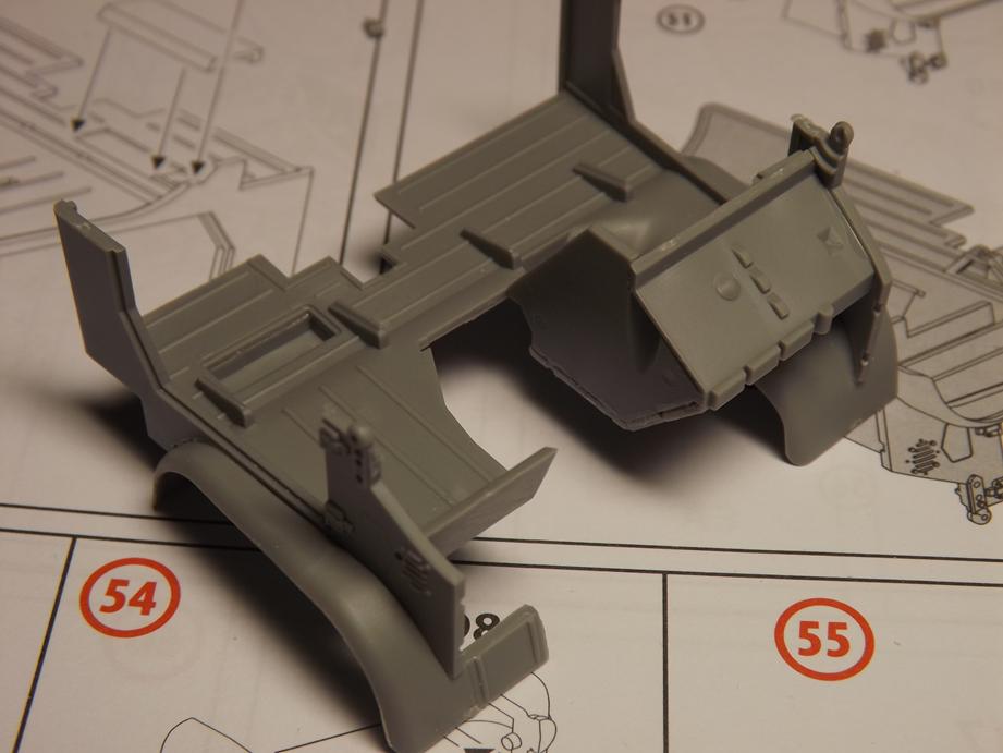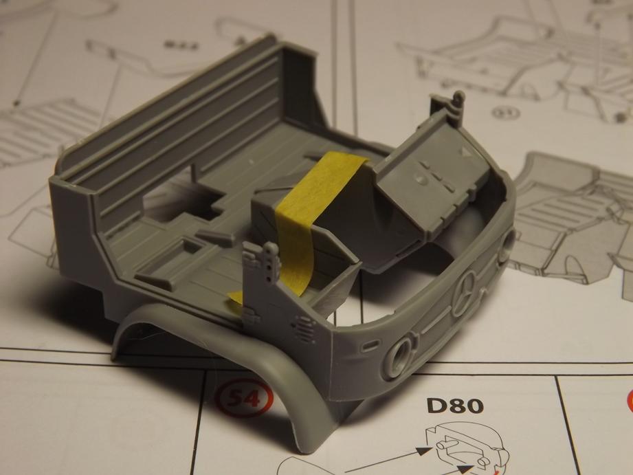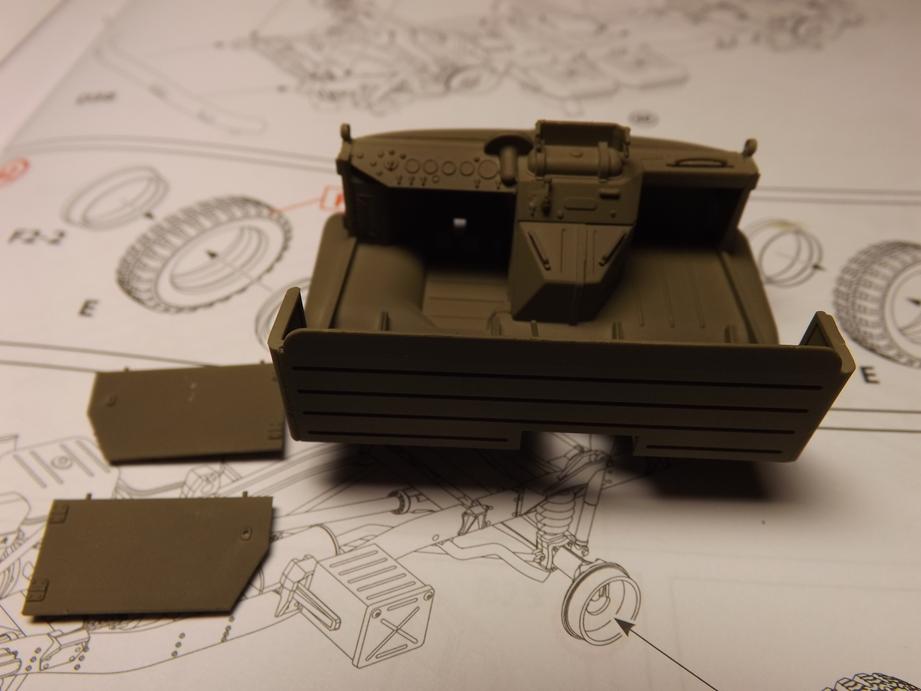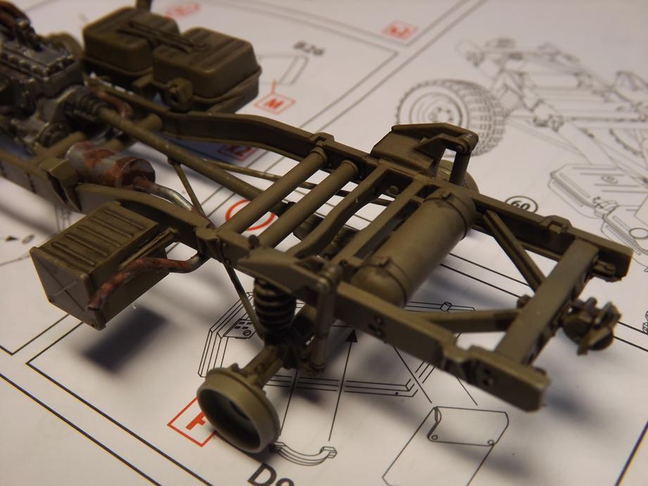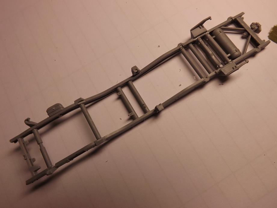 Den Aufbau legte ich jetzt schon einmal auf den Rahmen auf. Macht alles einen passablen Eindruck. Unter dem Boden des Kastens klebte ich noch diverse Zurüstteile wie Staukisten, Kanisterhalter und Aufstieghilfen sowie den Halter für das Ersatzrad.