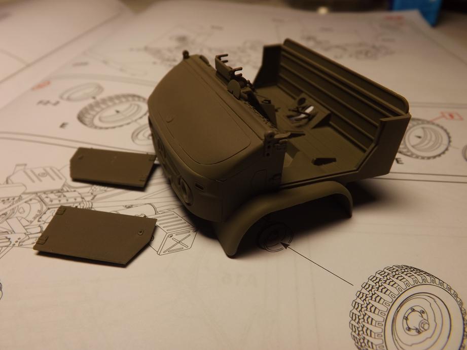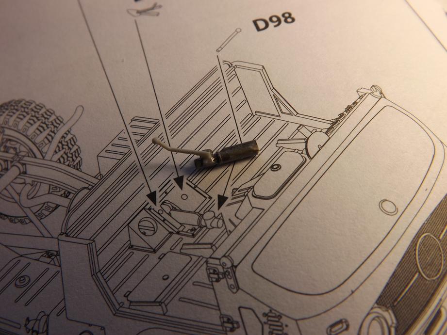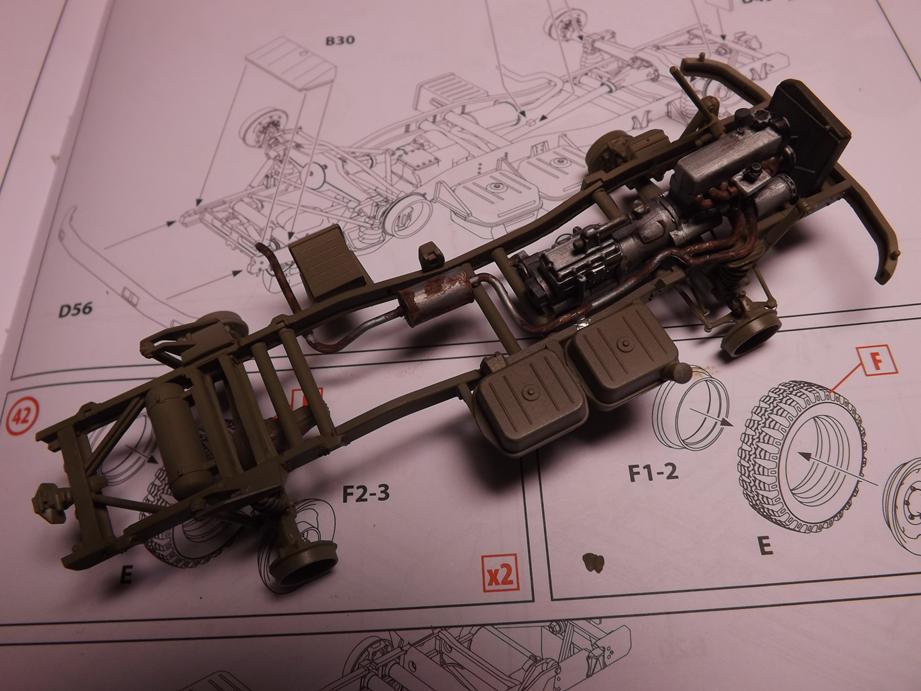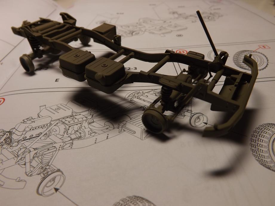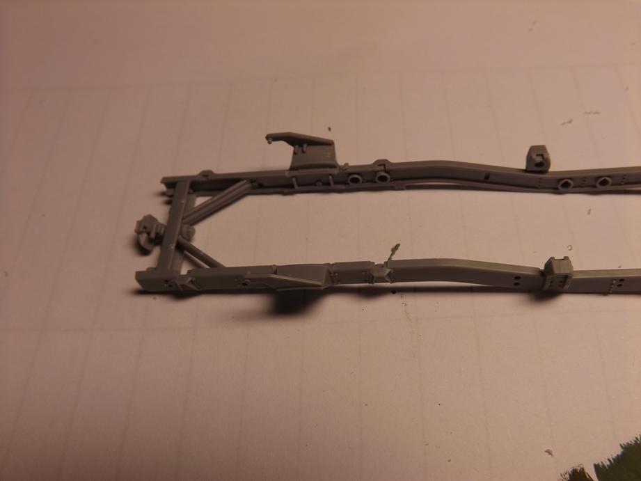 Den Aufbau legte ich jetzt schon einmal auf den Rahmen auf. Macht alles einen passablen Eindruck. Unter dem Boden des Kastens klebte ich noch diverse Zurüstteile wie Staukisten, Kanisterhalter und Aufstieghilfen sowie den Halter für das Ersatzrad.