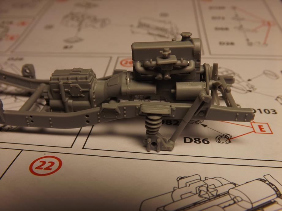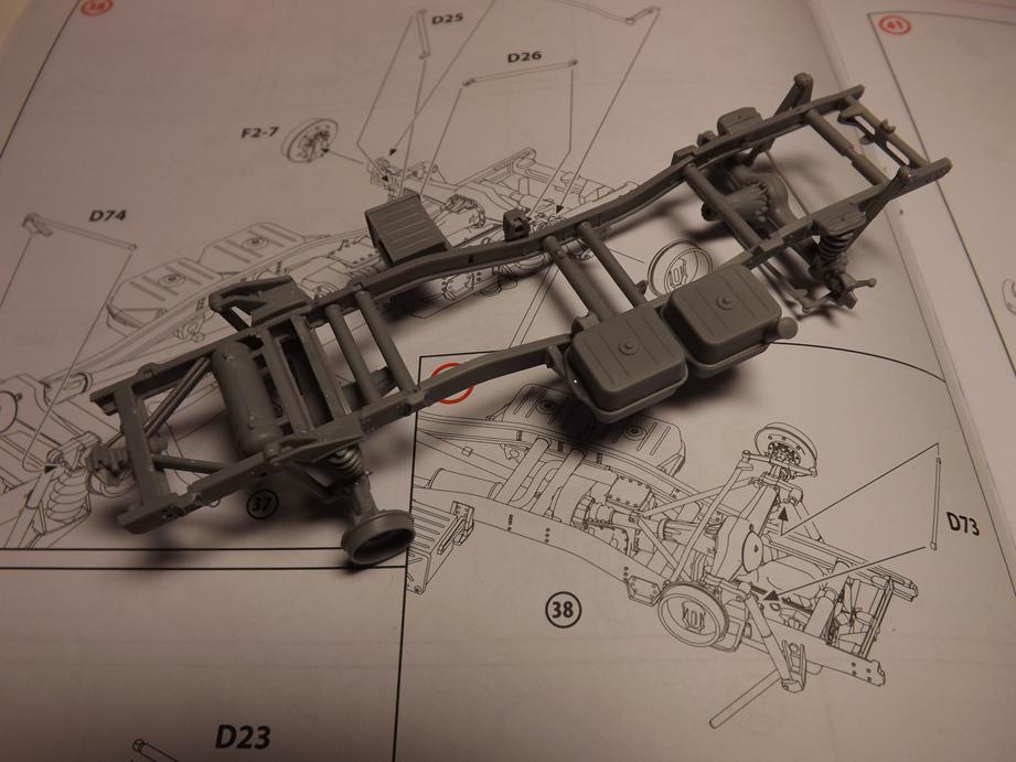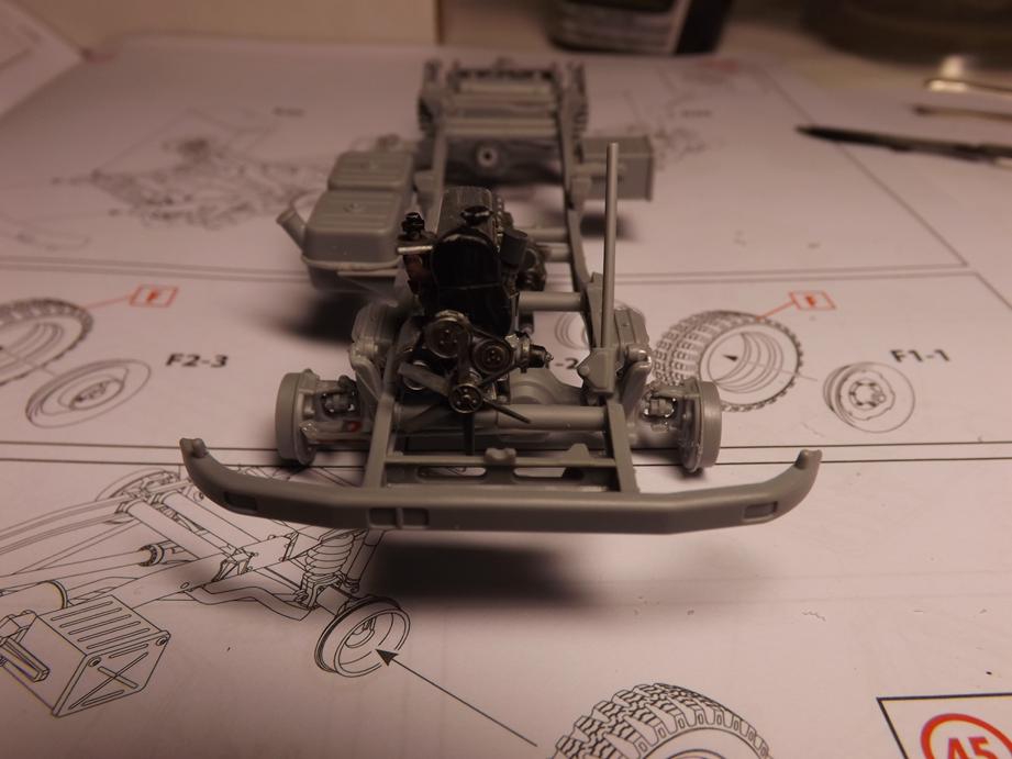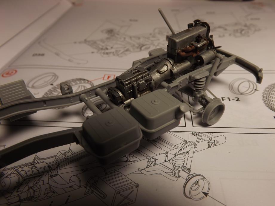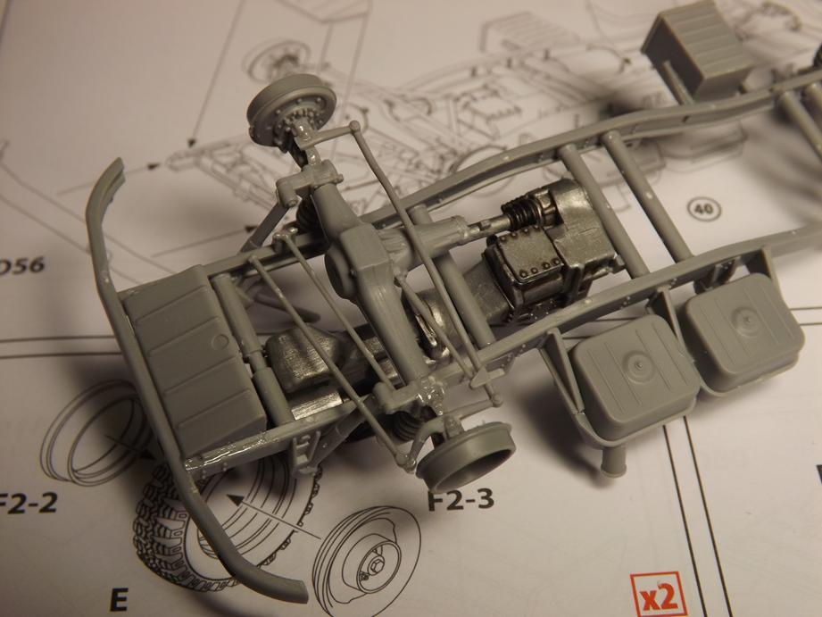 Von unten sieht das dann so aus. Bis jetzt gefällt das Modell sehr. Am Chassis ist nicht nur der Leiterrahmen vorhanden, sonderen auch das vollständige korrekte Lenkgestänge von der Lenksäule, über das -getriebe, quer unter dem Fahrwerk durch an die Achse und von dort auf die gegenüberliegende Seite. Selbst Stabilisatoren und Lenkungsdämpfer sind vorhanden. Es fühlt sich beinahe an, als würde es nach Öl riechen und ich hätte einen Schraubenschlüssel in der Hand.