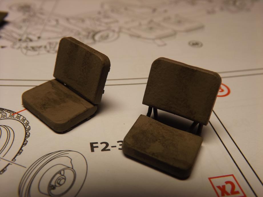 Die Sitze habe mich mit Aqua-Color 87 "Erdfarbe" bepinselt. Dazu nahm ich einen kurzen Borstenpinsel und tupfte die Farbe in drei Schichten auf. Das hat zur Folge, dass eine unebene Fläche entsteht, die so das Gewebe der sitzbezüge darstellen sollte. Nach dem Durchtrocknen legte ich etwas schwarzes Washing auf und übersprühte das Ganze mit Klarlack.