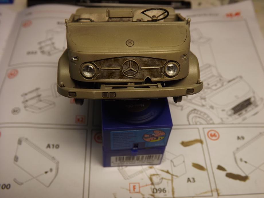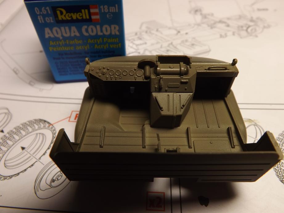 Für die spätere Farbe habe ich "Gelboliv 42" von Revell Aqua Color hier. Bei meinen diversen Grün- und Olivfarbtönen schien mir das die beste Entscheidung. Hat jemand Erfahrungen mit der Farbe von älteren BW-Fahrzeugen? Im Original schienen diese ja oft ausgeblichen und mit diversen Farbverläufen.