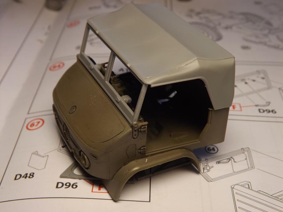Dann wurden noch die Rahmen der Front- und Seitenscheiben vorbereitet und das Verdeck aus dem Dach- und Seitenteil zusammengeklebt. Das Ganze setzte ich dann Probehalber zusammen.