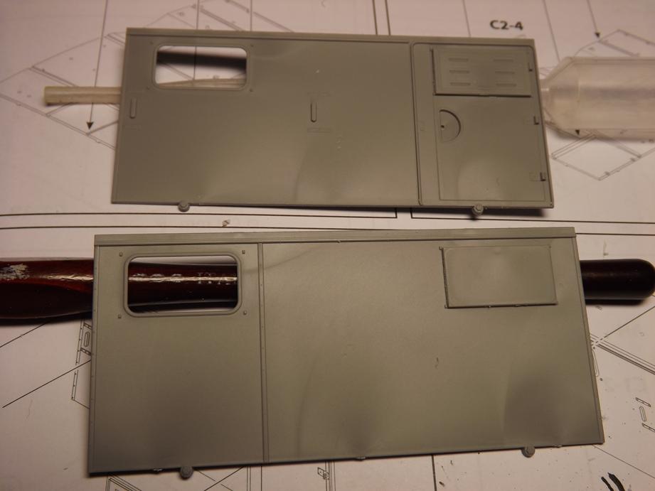 Neulich postete ich ein Bild der einzelnen Teile des Kastens. Dabei ist mir ein Fehler unterlaufen. Die linke Seitenwend, die ihr hier oben seht ist die richtige für den Funkkoffer. Es sind diverse Lüftungsgitter im vorderen Bereich vorhanden. Ich zeigte Euch die zweite Außenwand, die dem Bausatz beilag. Die hatte ich versehntlich verwechsel . Kommt halt davon, wenn man seinen Bauplan nicht richtig liest
