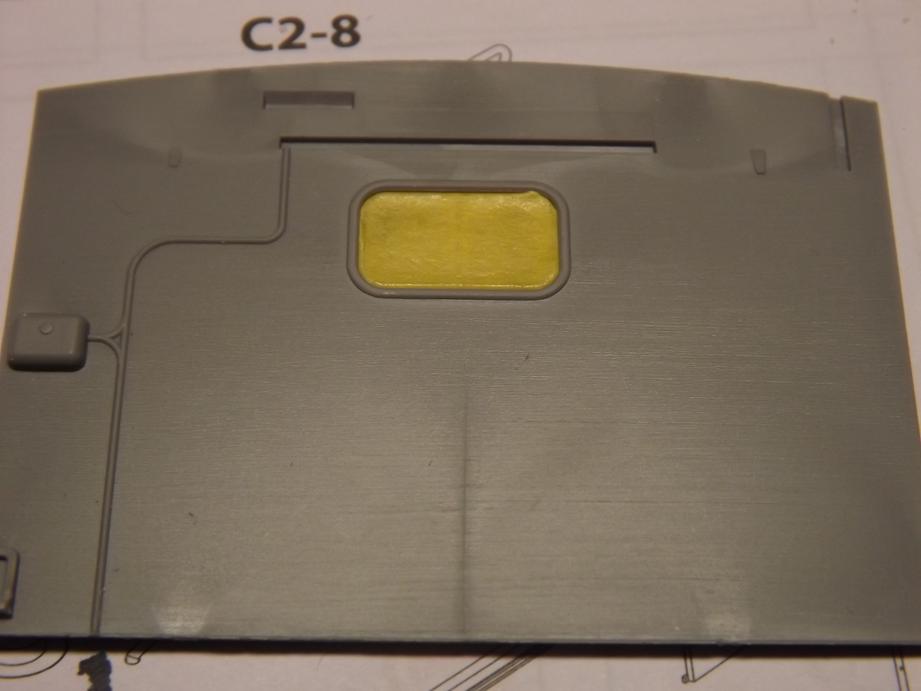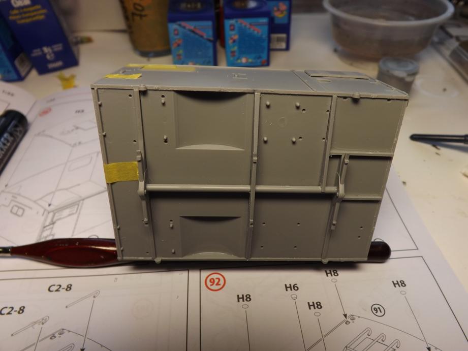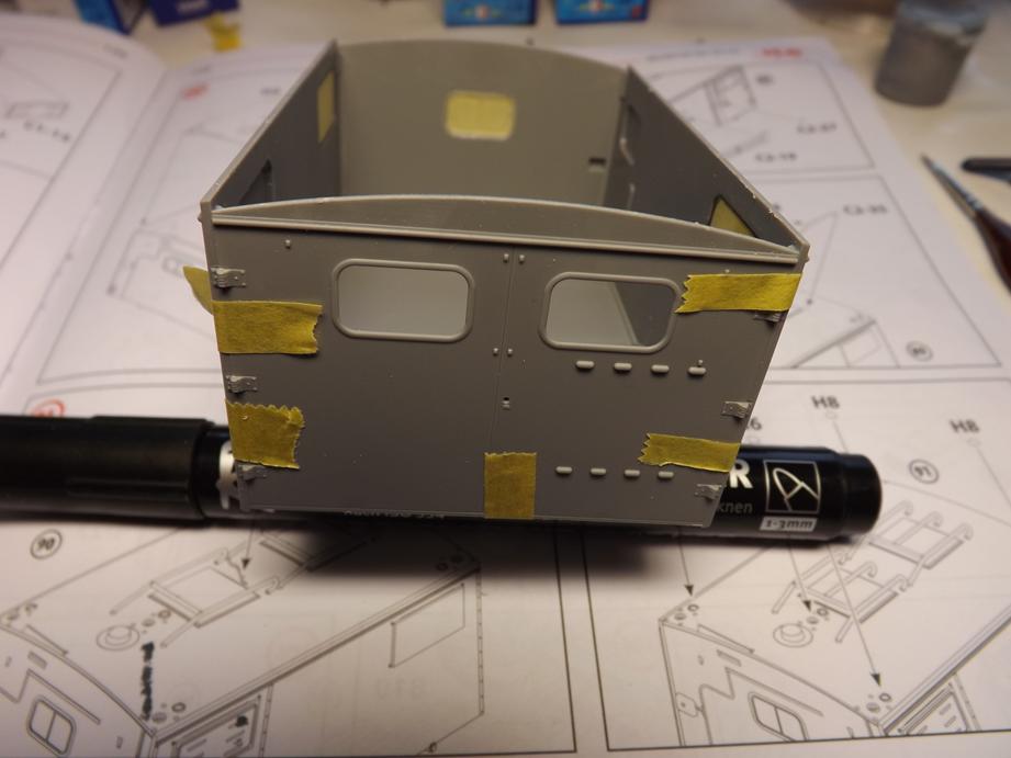 An den Seitenwänden klebte ich je einen Klappladen auf, in das jeweils andere Fenster, sowie in die Öffnungen vorne und hinten klebte ich Klarteile ein. Diese erhielten, wie schon bei der Frontscheibe beschrieben einen angedeuteten "Dichtungsgummi" aus schwarzem Filzstift. Vor dem Einkleben der Klarteile maskierte ich diese mit Masking-Tape. Dieses klebte ich auf und schnitt das, was überstand mit einem Skalpell am Rand ab. So kann ich die Scheiben vor dem Lackieren einfügen und sie bleiben schön sauber.