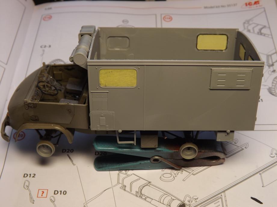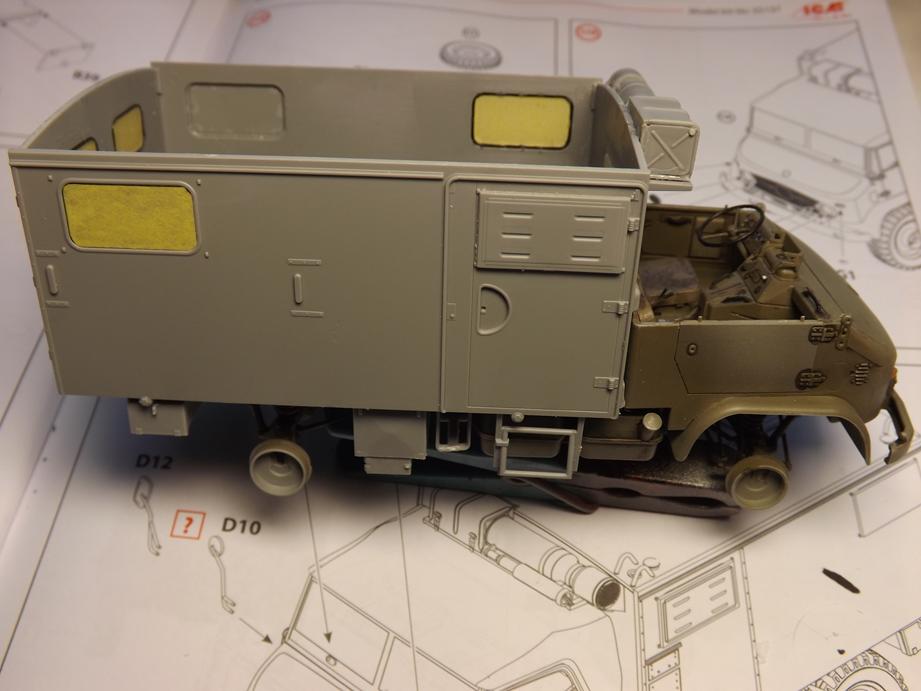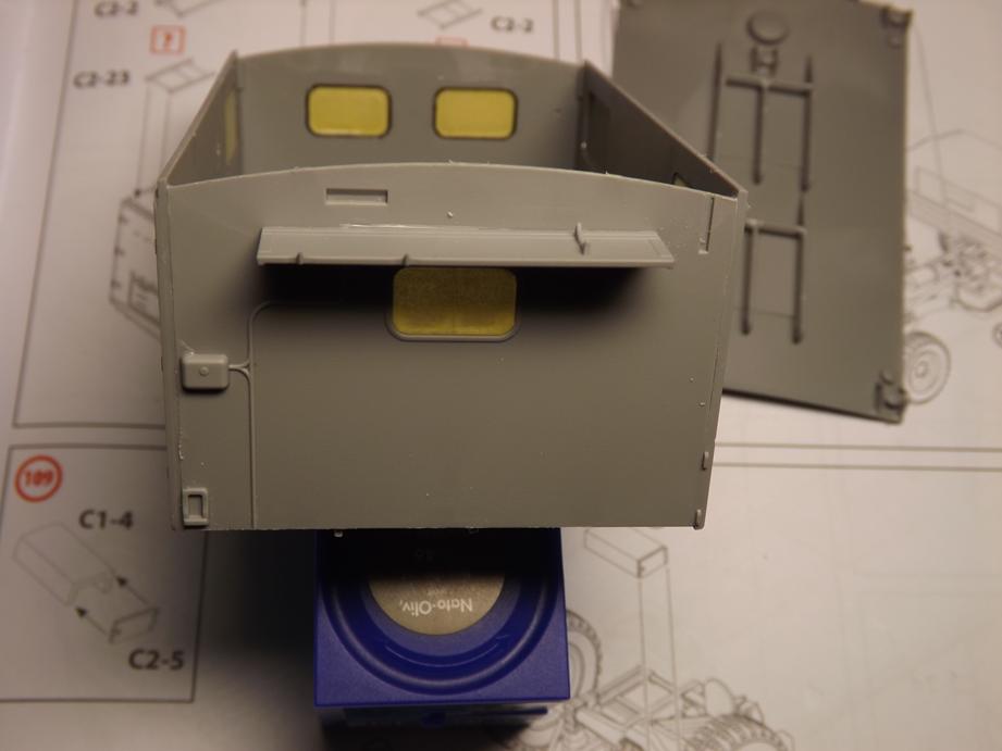 Die Seitenscheiben der Türen, die beim Original aus Metallrahmen, die mit Plane und Folie bezogen sind bestehen, habe ich zwischenzeitlich auch zusammengefügt, bemalt und mit einem Washing versehen. So weit für heute, bis bald.