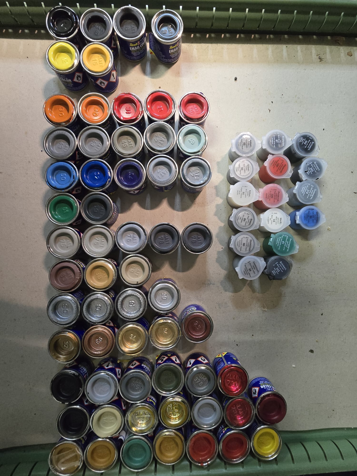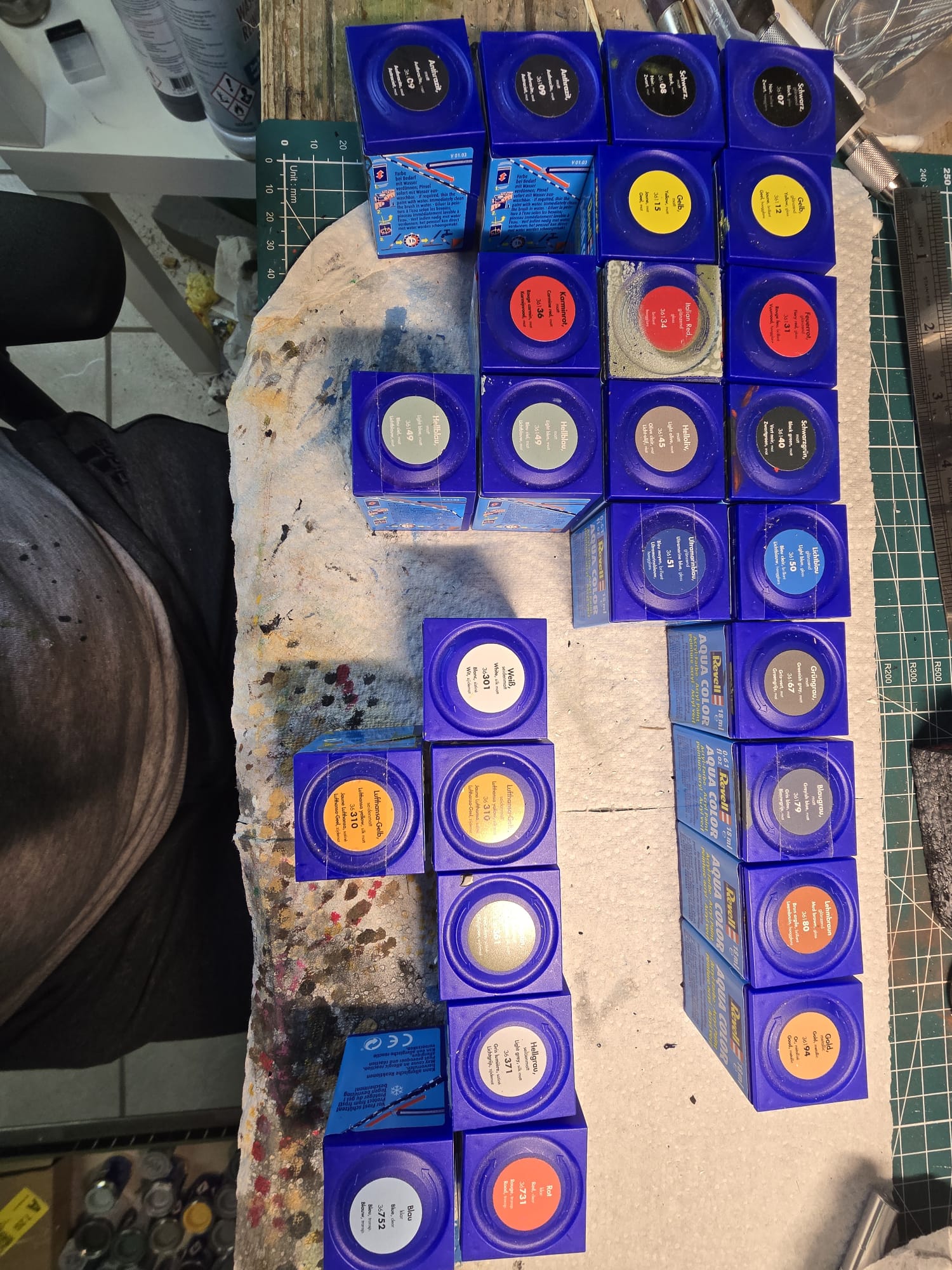 nachdem ich mich entschieden habe, nur noch Tamiya, Vallejo und Kaleido Farben zu verwenden.... biete ich euch mein gesamtes Konvolut von Revellfarbdosen an. Viele sind noch ungeöffnet, andere benutzt, aber noch zu gebrauchen.... obwohl nicht alle geöffnet habe.