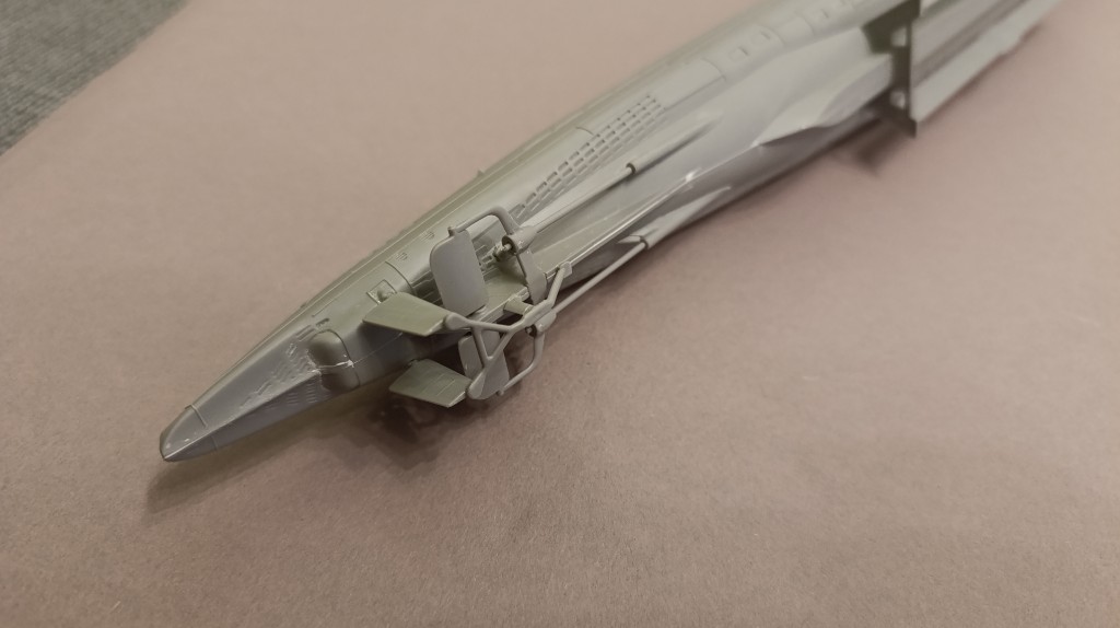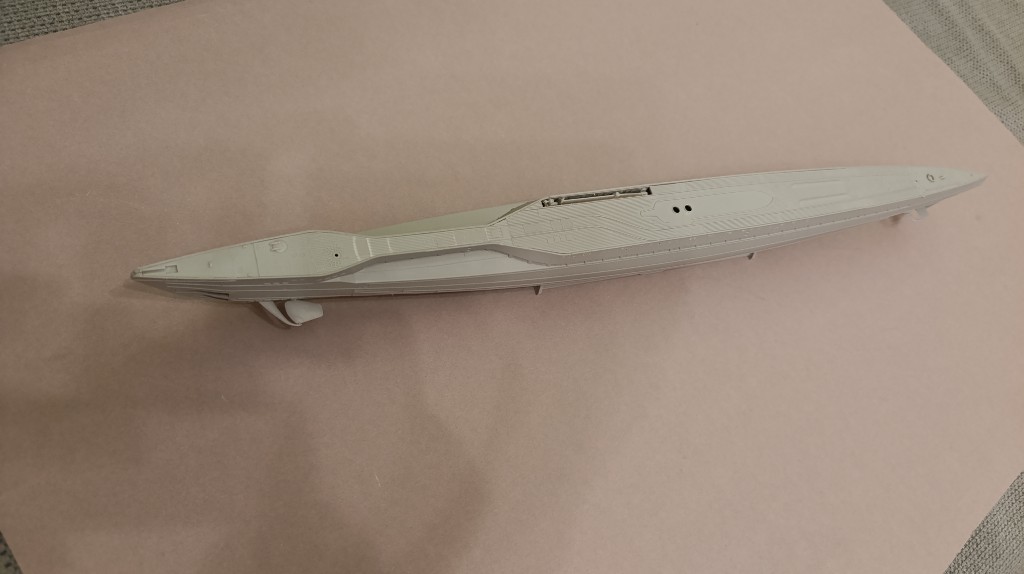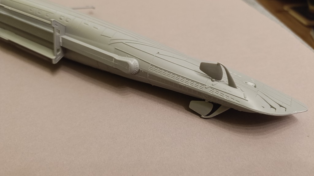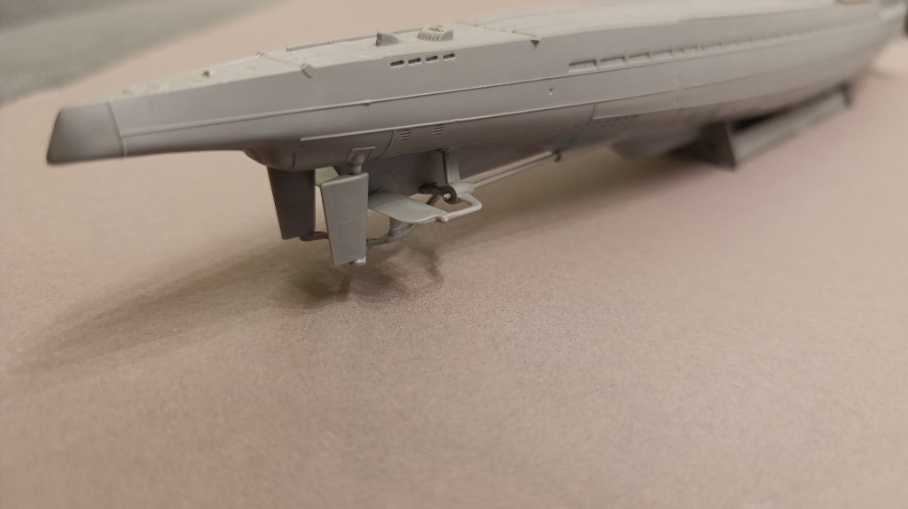 Die Tiefenflossen vorne sind auch angebracht. Außerdem würde hier der untere Teil am Kiel noch angebracht, was aber einige Passprobleme hat und nicht ohne Spachtel auskommt.