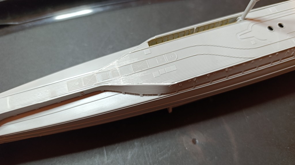 Das selbe passierte auf der anderen Seite. Da ich das PE-Teil für das Deck nicht verwenden werde, weil es kein wesentlich Mehrwert hat,habe ich es auf den normalen Bausatzdeck angebracht.