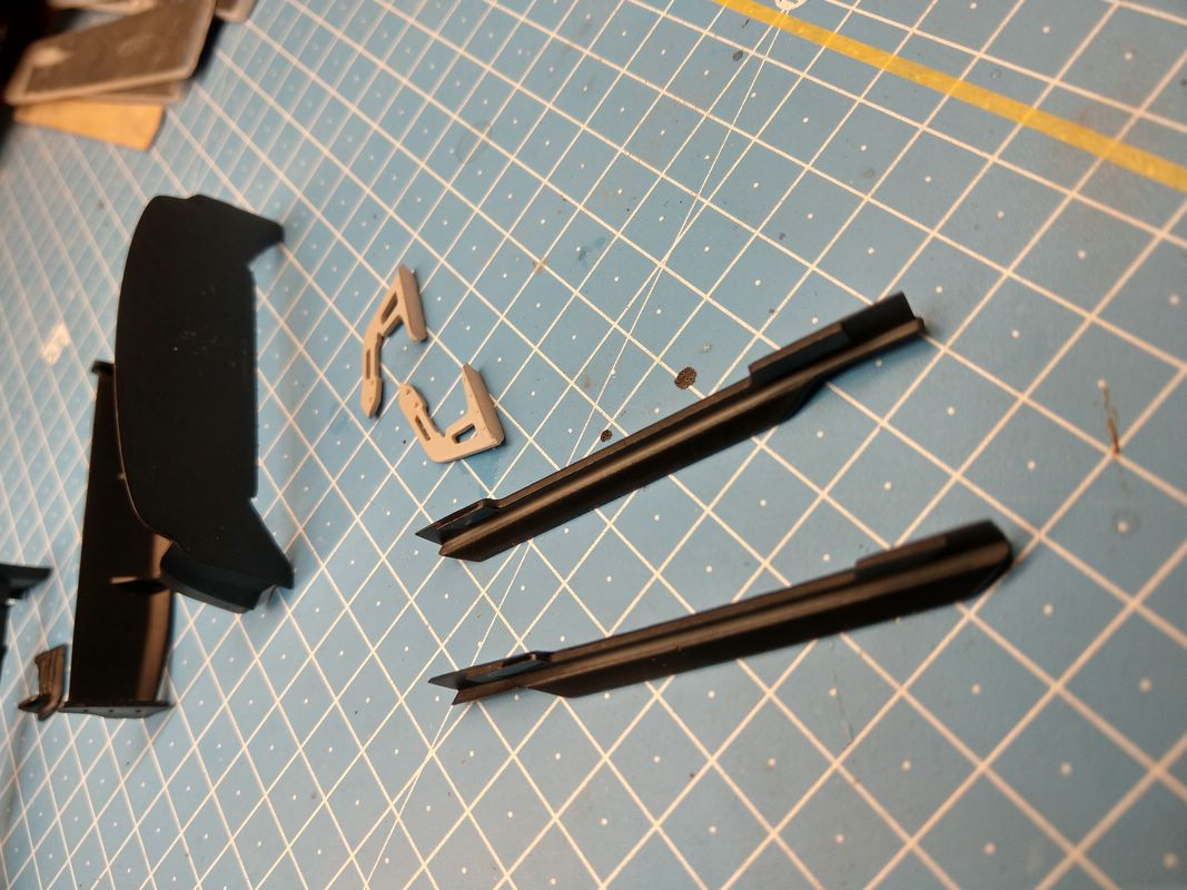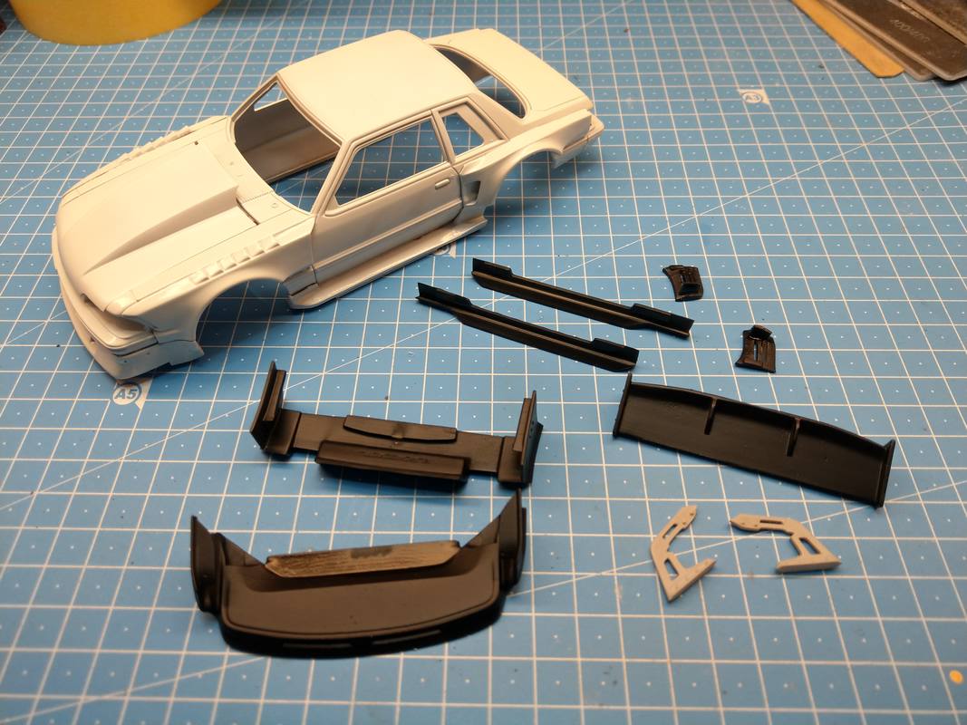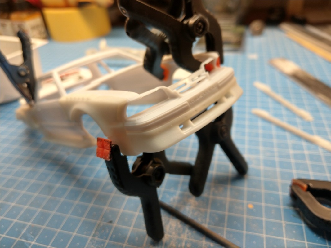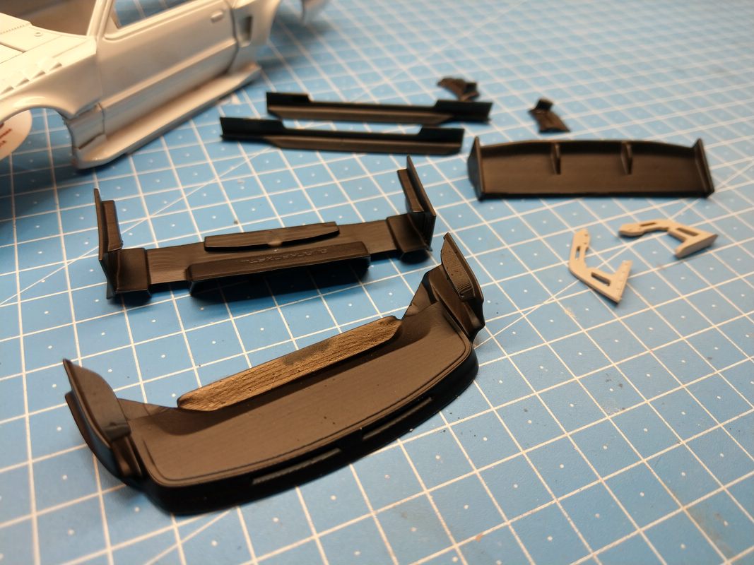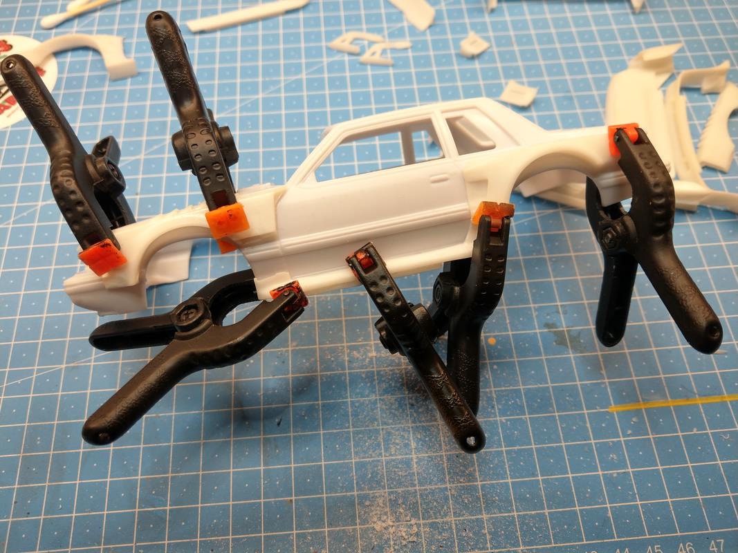 Alles in allem bin ich mit der Paßgenauigkeit zufrieden. Die Anlageflächen des Heckspoilers, der vorderen Kotflügel habe ich innen etwas abdremeln müssen. Nichts wildes. Und nichts, was genug Klammern nicht in den Griff bekommen.