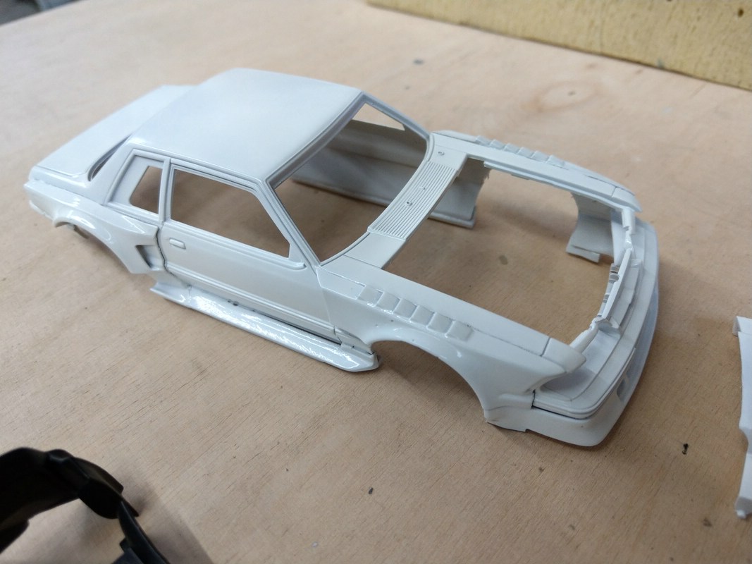 Nachdem die Verbreiterungen angebracht sind habe ich die Karosserie naßgeschliffen, grundiert und seine erste Schicht weiß drauf geknallt.