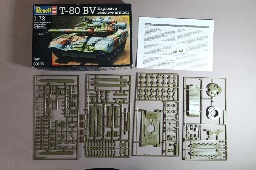 Der T-80 von Revell stammt tatsächlich ursprünglich nicht direkt aus Bünde, sondern von Matchbox, allerdings zu der Zeit als die Modellbausparte bereits Revell gehörte. Das war 1990 und damals die erste Bausatzform des berüchtigten letzten sowjetischen Panzers, dessen Mythos wenige Jahre später bei Grossny gebrochen wurde. 1996 kam dann diese Auflage bei Revell raus. Das Modell war damals einer der ersten, welche sich in die neue Generation 1:72 Panzer aus Bünde einreihte. Damals kam auch der Sherman und der erste Leopard 2-Bausatz aus der selben (letzten) Generation von Matchboxbausätzen. Leider kann der T-80 aber nicht mit modernen Bausätzen mithalten, es gibt viele Details die nicht berücksichtigt wurden oder verienfacht sind. Daher habe ich zusätzlich noch den Hauler-PE-Bogen organisiert.