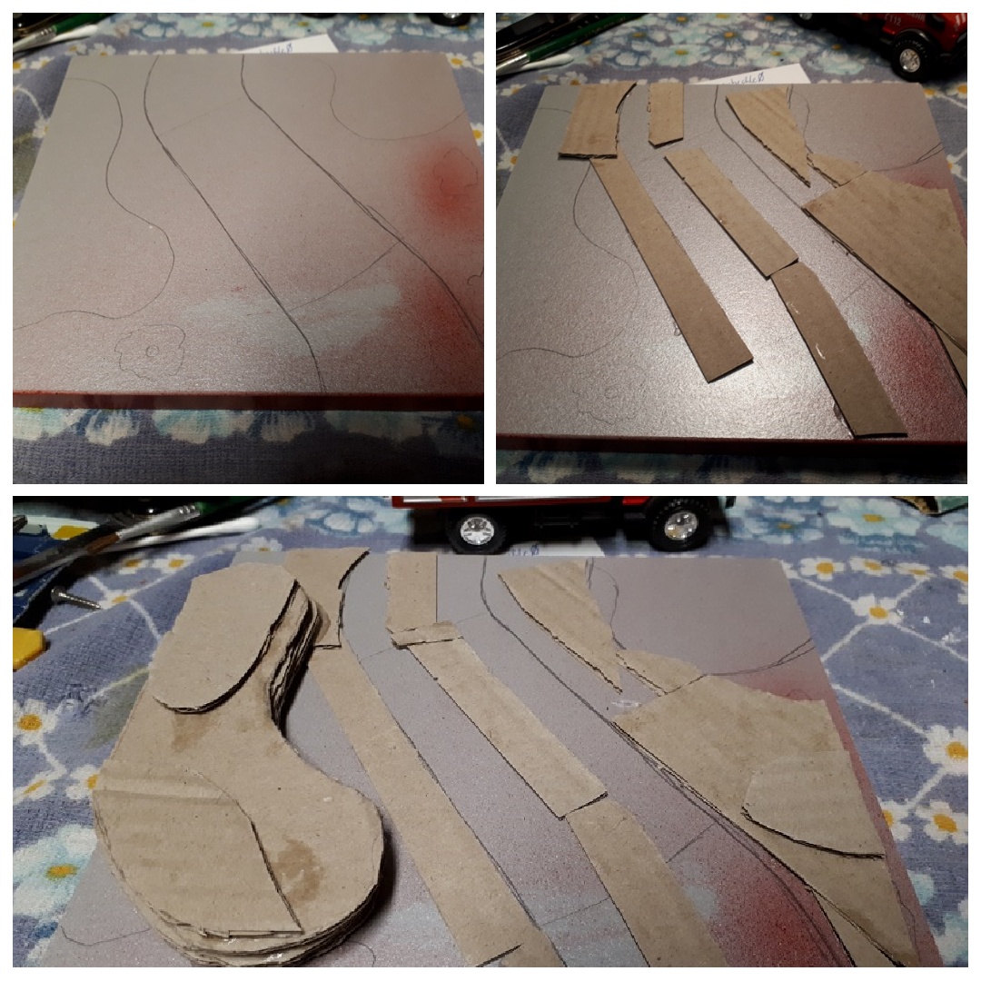 Mit Pappkarton einen "ausgefahrenen Weg", ein "Wasserloch" und ein großen "Steinbrocken" kleben.